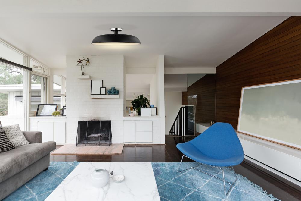 Designed with neutral, clean lines, the Colony large semi-flush is ideal for an eat-in kitchen, entryway, hallway and even a bedroom. The loft-style shallow pan metal shade is done in matte black, with a white interior to reflect the downfacing lamp. The p
