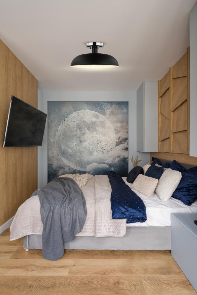 Designed with neutral, clean lines, the Colony 60-7492 small semi-flush is ideal for an eat-in kitchen, entryway, hallway and even a bedroom. The loft-style shallow pan metal shade is done in matte black, with a white interior to reflect the downfacing lam