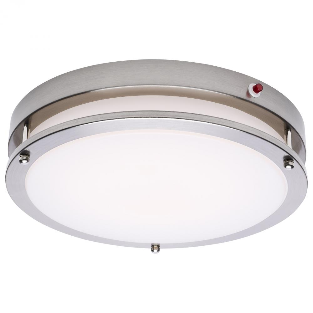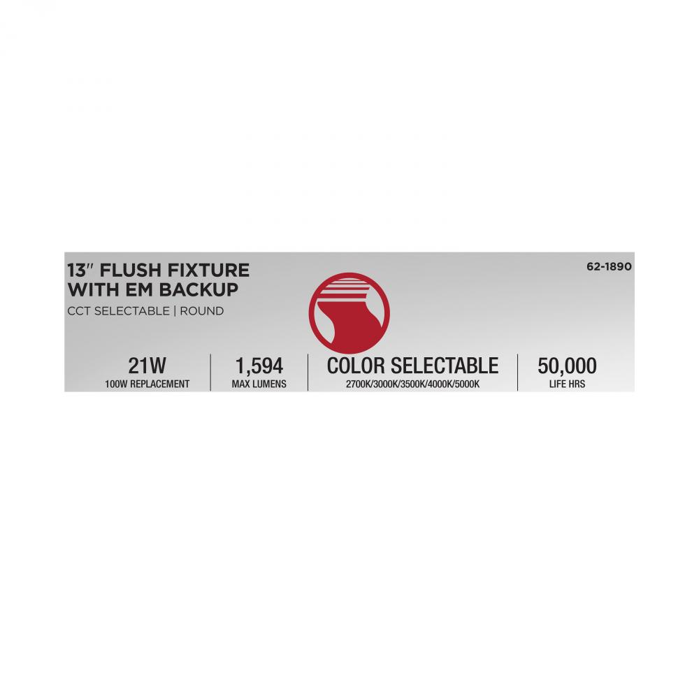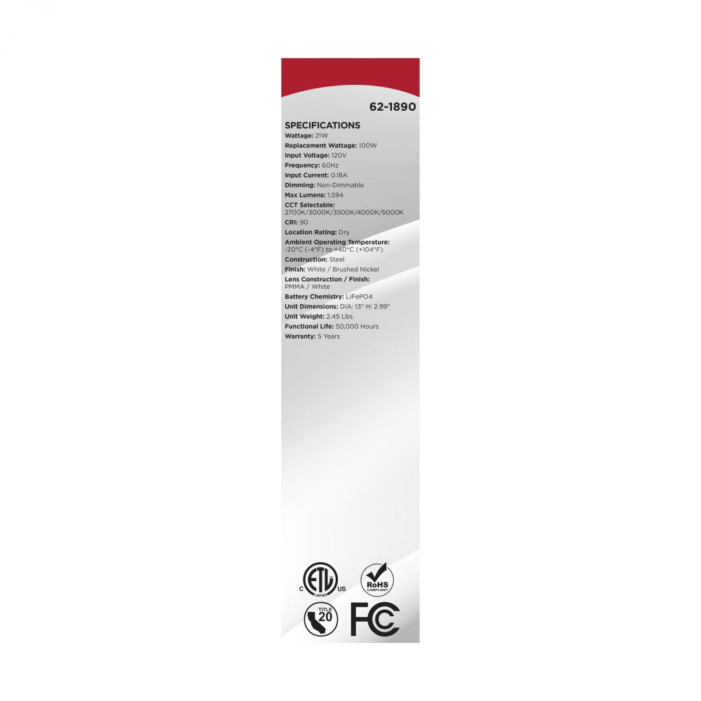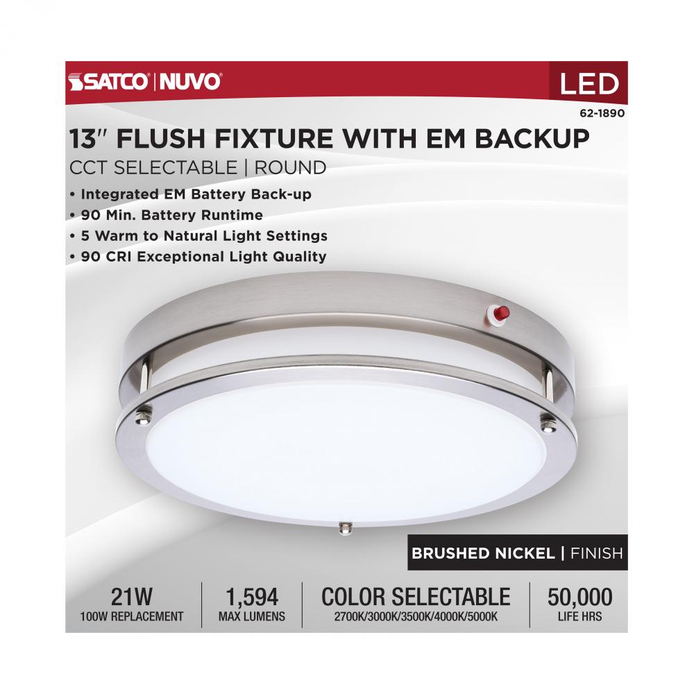 The SATCO NUVO 62-1890 13-Inch Glamour LED flush mount fixture in brushed nickel features a built-in emergency battery backup that provides up to 90 minutes of illumination during power outages-offering critical reliability with an elegant design. An integ