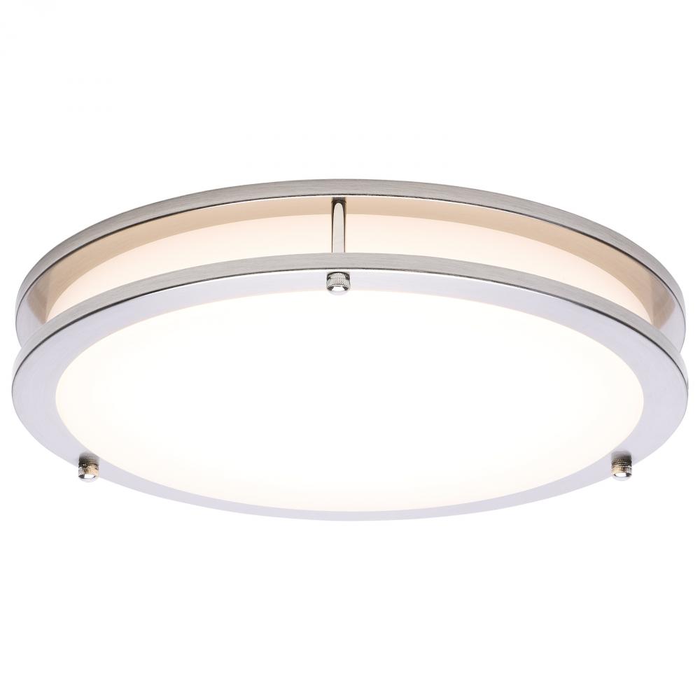 The SATCO NUVO 62-1876 Glamour 13-inch Round Flush Mount in Brushed Nickel delivers sleek, modern lighting with 5 CCT selectable technology (2700K–5000K) and 90 CRI illumination for enhanced color rendering. This 25-watt fixture replaces 150W incandescen