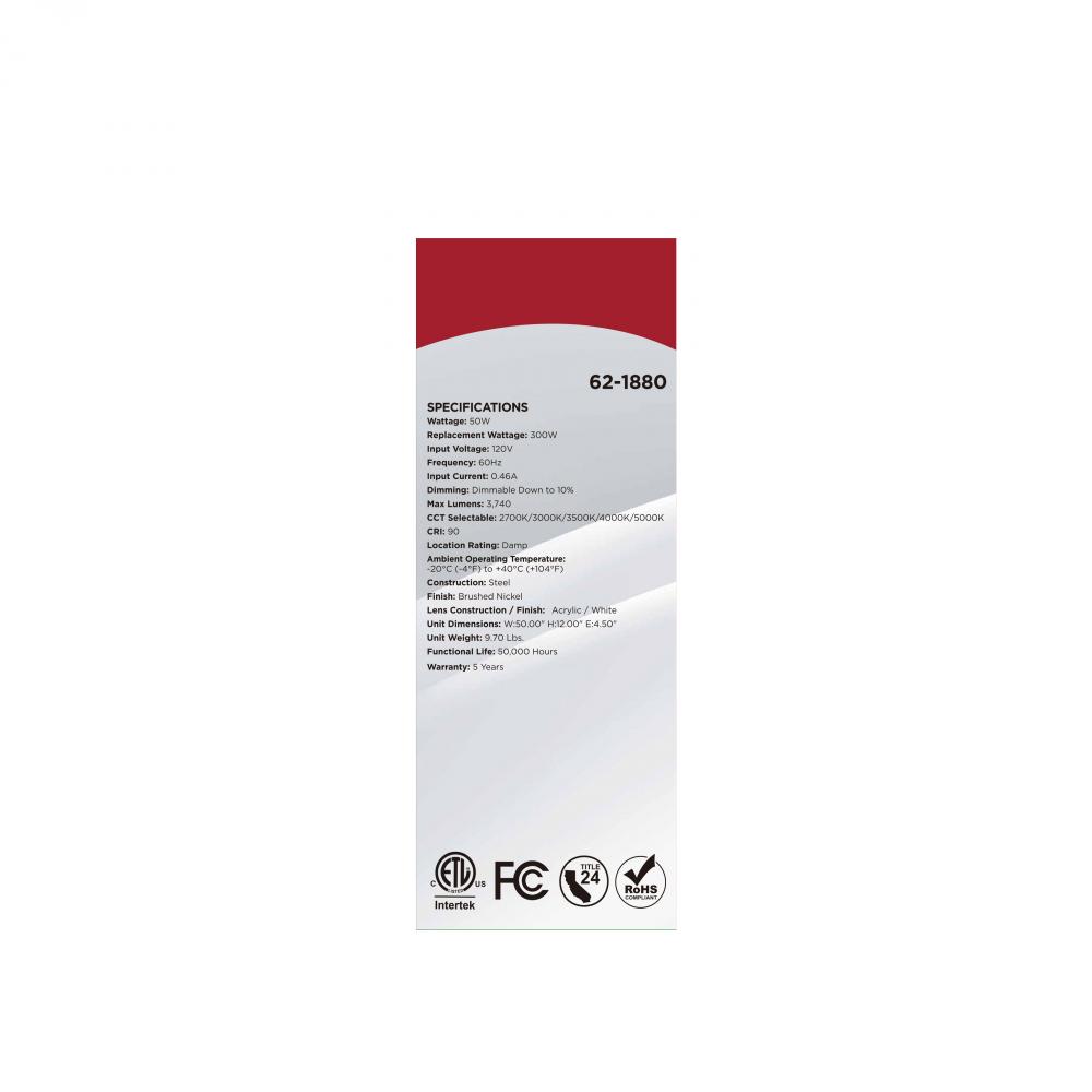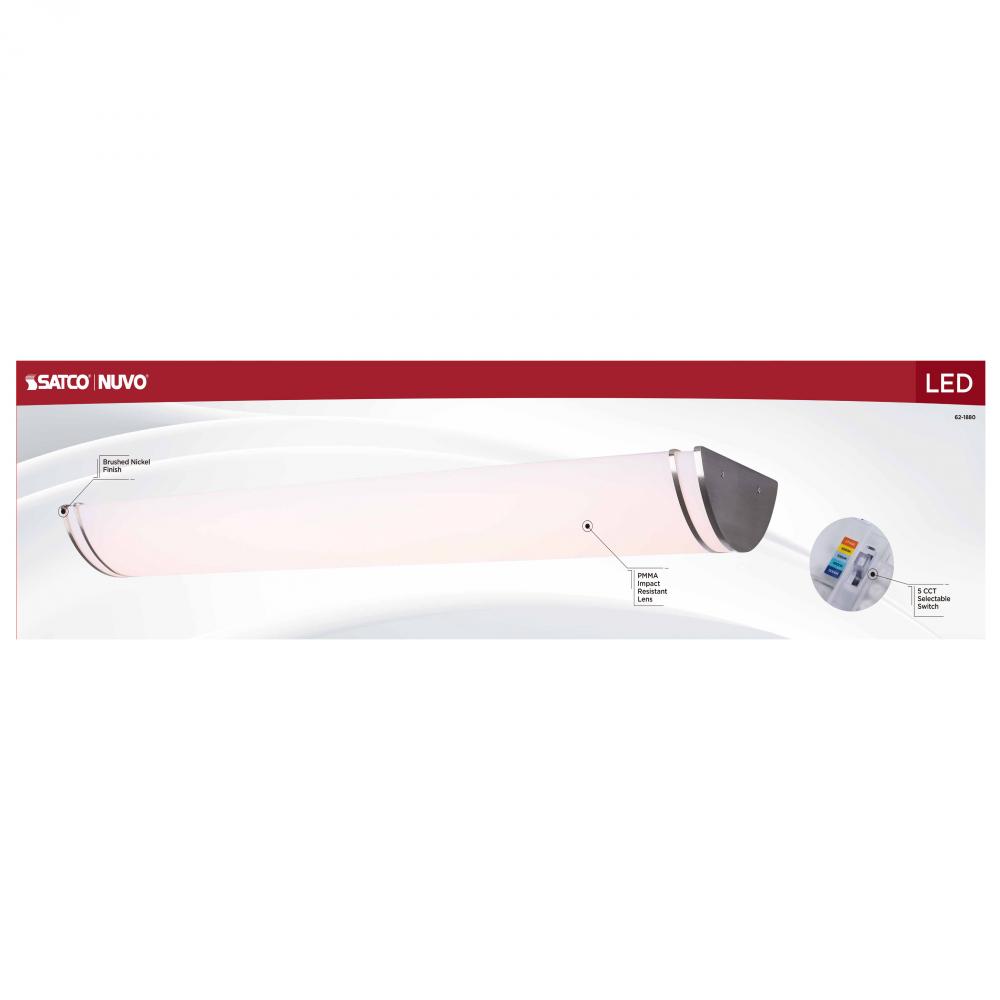 The SATCO NUVO 62-1880 Glamour 50-inch Linear Fixture in Brushed Nickel combines modern design with 5 CCT selectable technology (2700K–5000K) and 90 CRI illumination for enhanced color rendering. This 50-watt fixture replaces 300W incandescent lighting,