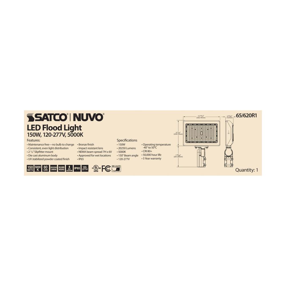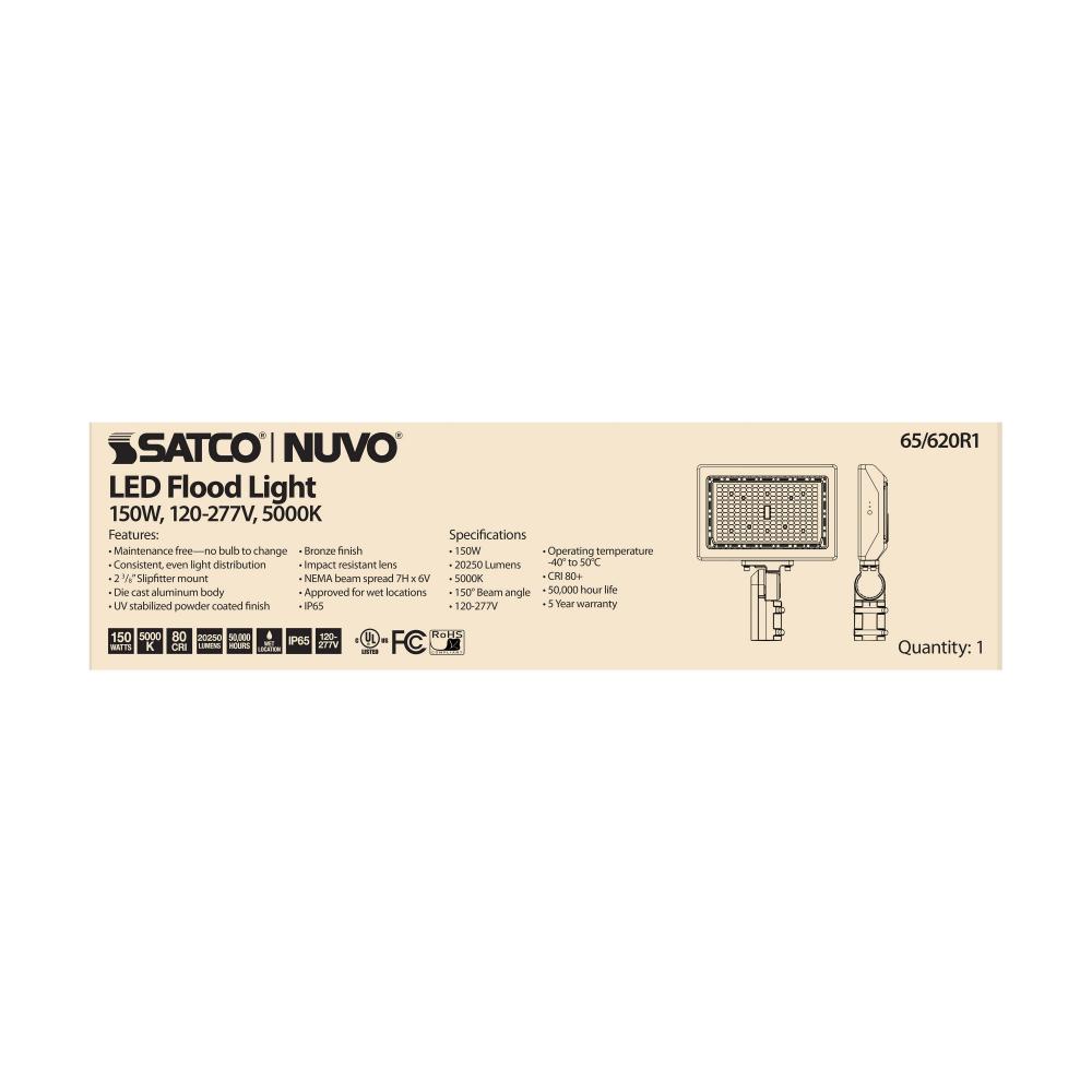 SATCO NUVO's 65-620R1 150 watt flood light adds intrigue to the outdoor architectural landscape. This commercial, LED flood light provides even and consistent light distribution, while offering a wide range of mounting options. Dimmable, with a bronze