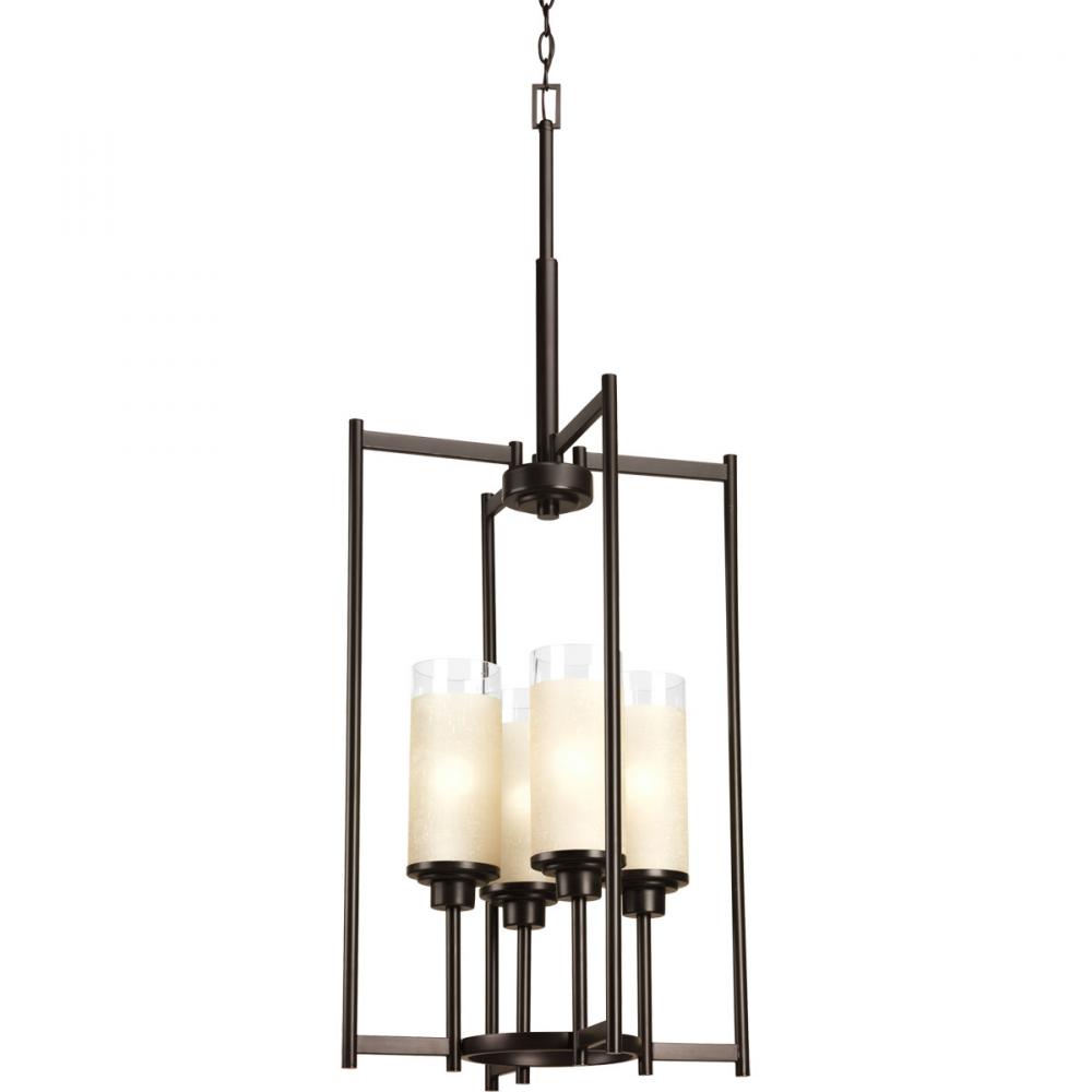 Four-light foyer with etched umber linen finished glass is complemented with a crisp, clear edge accent strip. This collection offers the best of traditional and modern highlight with a Antique Bronze finish.
