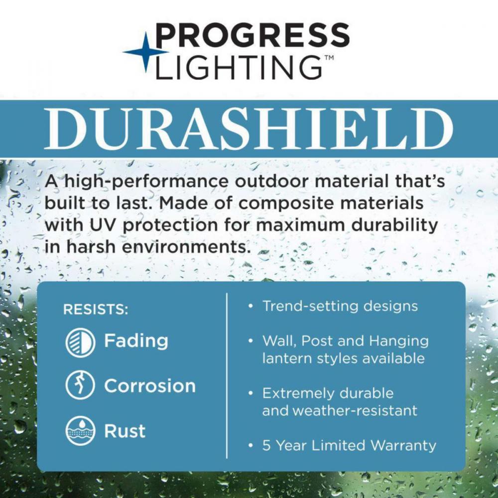 Beckon family and friends home with the coastal glow of this post lantern. Clear seeded glass panes that evoke memories of salty sea spray as a light base rests within the enclosure. The panes are housed in a timeless black frame that is corrosion-resistant for excellent longevity. DURASHIELD by Progress Lighting is built to last. Constructed from a composite polymer with UV protection, DURASHIELD holds up even in the harshest weather conditions. This high-performance finish has a 5-year warranty and is resistant to rust, corrosion, and fading.