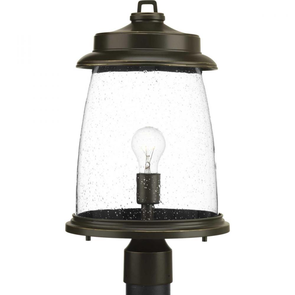 Conover is an outdoor lantern collection featuring nautical influences. A protective die cast ring surrounds beautiful clear seeded glass. Vintage metallic finishes are available for this collection that is sure to enhance curb appeal for a variety of exteriors. Post Lantern in a Antique Bronze finish.