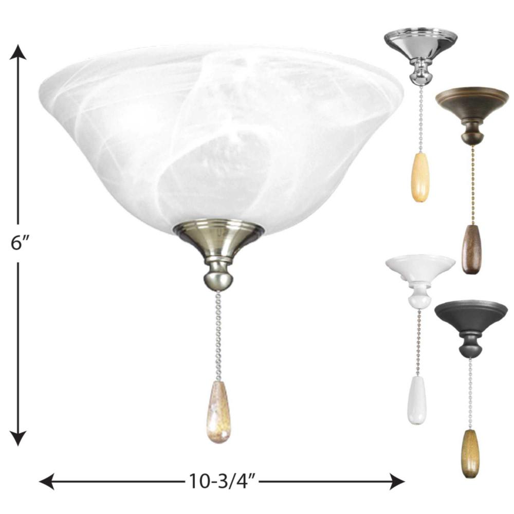 Alabaster style glass bowl ceiling fan light kit casts an inviting illumination in any size room. Includes (-09) Brushed Nickel, (-15) Polished Chrome, (-20) Antique Bronze, (-30) white, and (-143) Graphite finials for use with matching Progress Lighting fans. Universal style lets you use with any indoor fan that accept an accessory light. Quick-connect wiring makes the installation process quick and easy. Includes two 3000K, 800 lumen each (source), Title 24 certified LED bulbs.