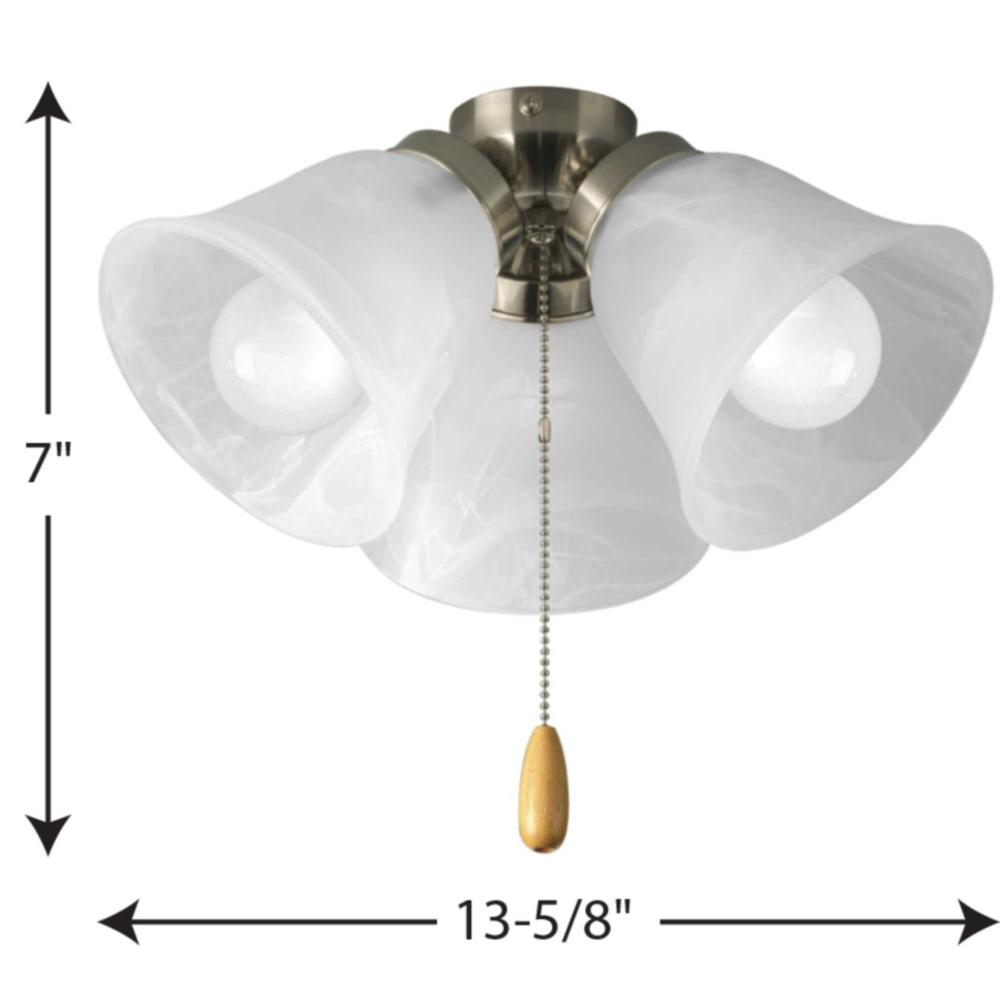 Add style and light to your ceiling fan with this universal fan light kit.;Alabaster style glass shades;Chrome pull chain w/ maple fob;Quick-connect wiring to any progress fan that accept an accessory light.;Includes three 3000K, 800 lumen each (source), T