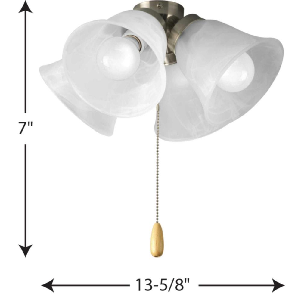 Add style and light to your ceiling fan with this universal fan light kit.;Alabaster style glass shades;Chrome pull chain w/ maple fob;Quick-connect wiring to any progress fan that accept an accessory light.;Includes four 3000K, 800 lumen each (source), Ti