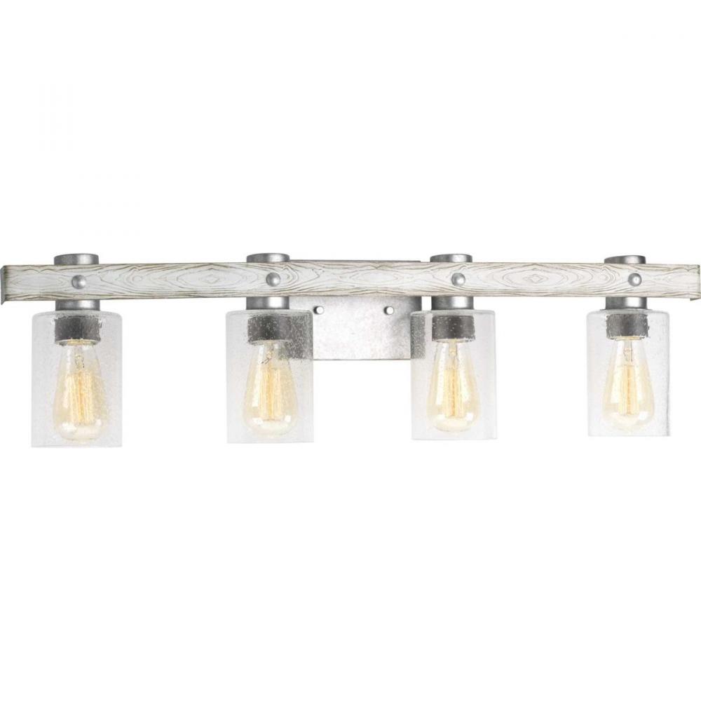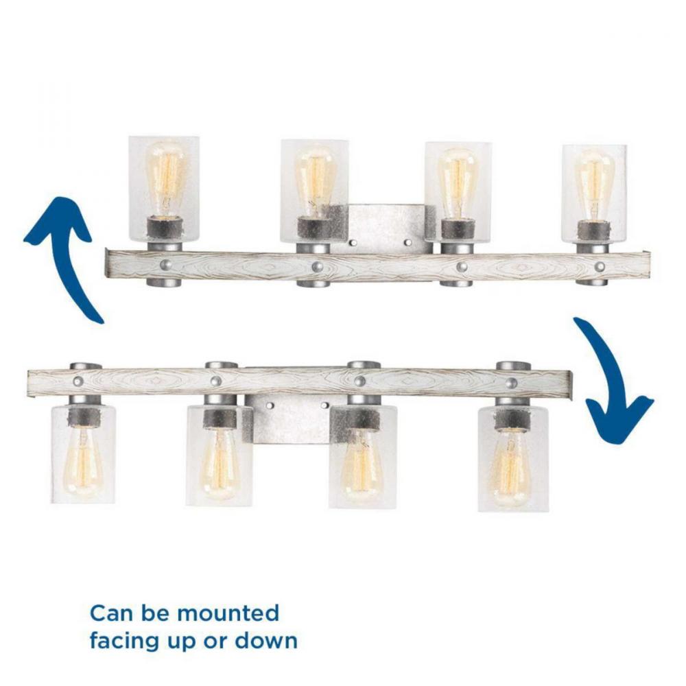 Ideal for a bathroom;Perfect for coastal, farmhouse, rustic, and urban industrial style settings;Gorgeous galvanized finish hand painted antique white faux wood accents;Rustic clear seeded glass shades;Mount the light fixture facing up or down;Use 4 medium