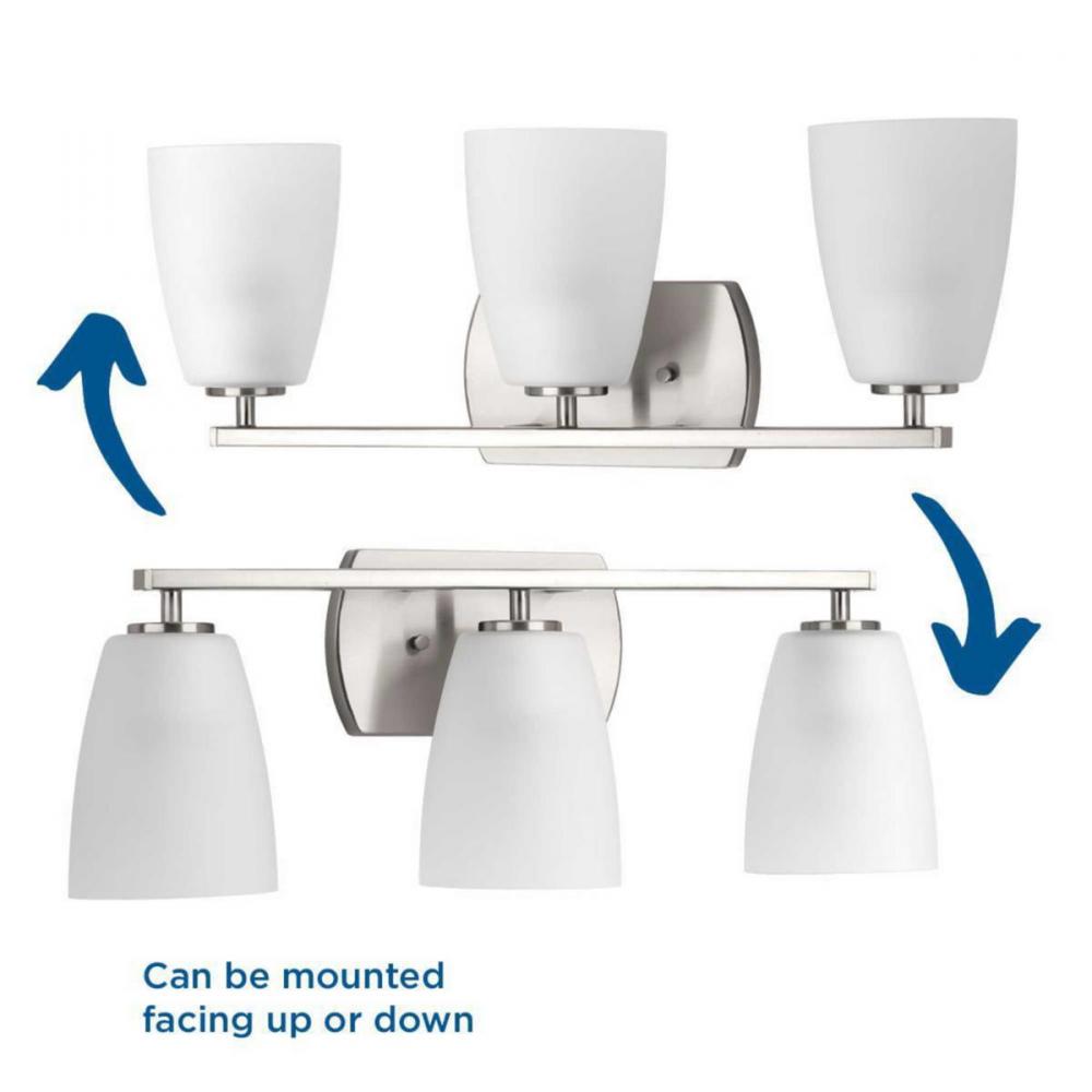 Ideal for a bathroom;Perfect for modern and transitional style settings;Beautiful brushed nickel finish;Elegant etched glass shades;Mount the light fixture facing up or down;Use 3 medium base bulbs that are sold separately (100 W max - LED/CFL/incandescent