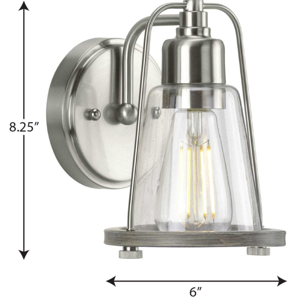 Application: Create a relaxing seaside haven with the Conway Collection 1-Light Brushed Nickel Clear Seeded Farmhouse Bath Vanity Light ideal for any entryway, hallway, foyer, bedroom, sitting room, living room, or bathroom.;Style: Perfect for farmhouse an