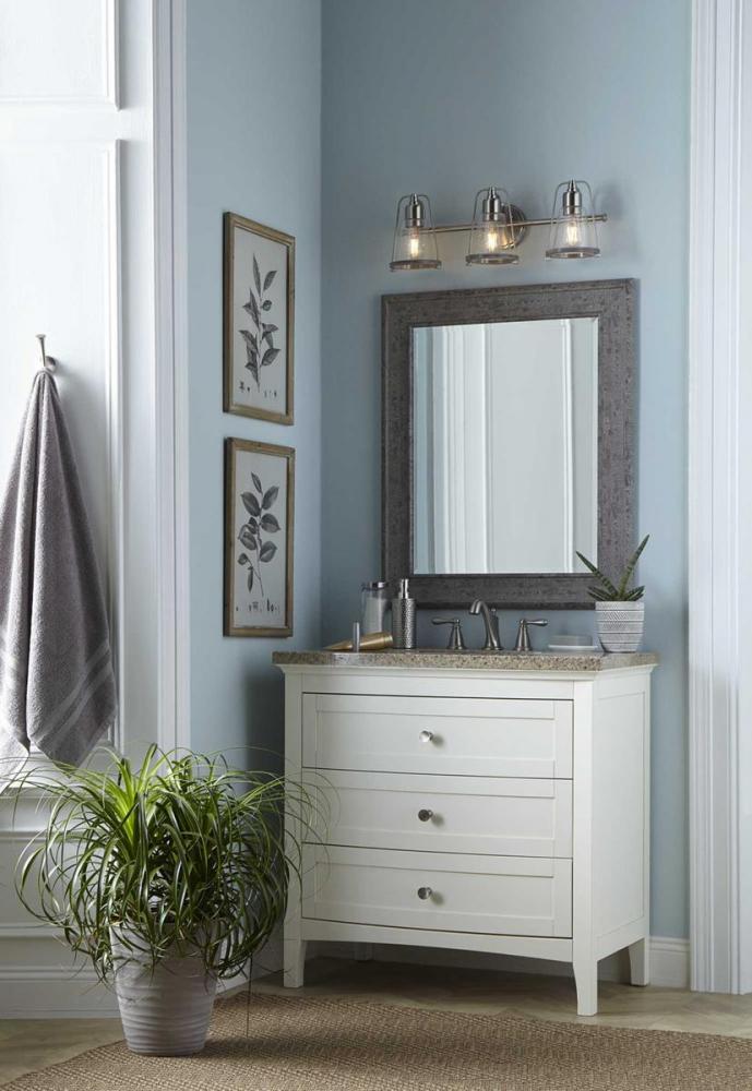 Mix old and new for charming character with the Conway Collection 3-Light Brushed Nickel Clear Seeded Farmhouse Bath Vanity Light. A brushed nickel bell-shaped frame and round backplate are accented by hand-painted, weathered grey wood-style accents for a charming nautical aesthetic. A light source glows from within a clear seeded glass shade for visual texture.