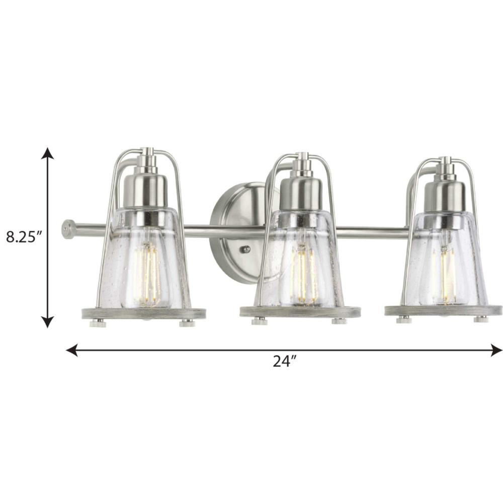 Application: Create a relaxing seaside haven with the Conway Collection 3-Light Brushed Nickel Clear Seeded Farmhouse Bath Vanity Light ideal for any entryway, hallway, foyer, bedroom, sitting room, living room, or bathroom.;Style: Perfect for farmhouse an