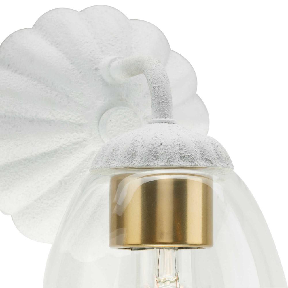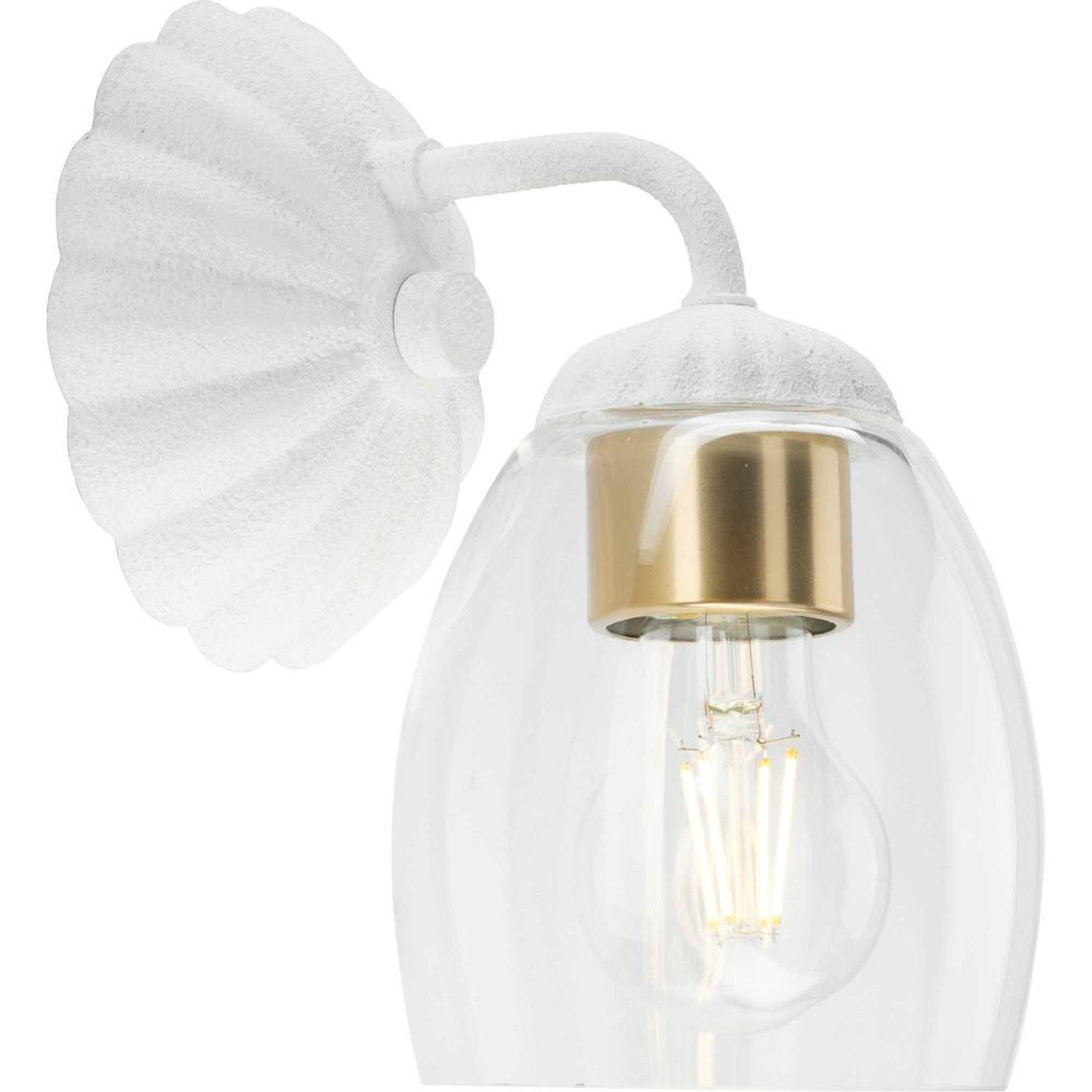 The Quillan One-Light Vanity Light offers a graceful flourish to add distinctive designer touch. Scalloped elements create a richness of detail to complement the clarity of its clear, elliptical glass shade. Each fixture includes both matching and contrasting accent rings. This versatile light can be mounted up or down to provide clear illumination to the room.
