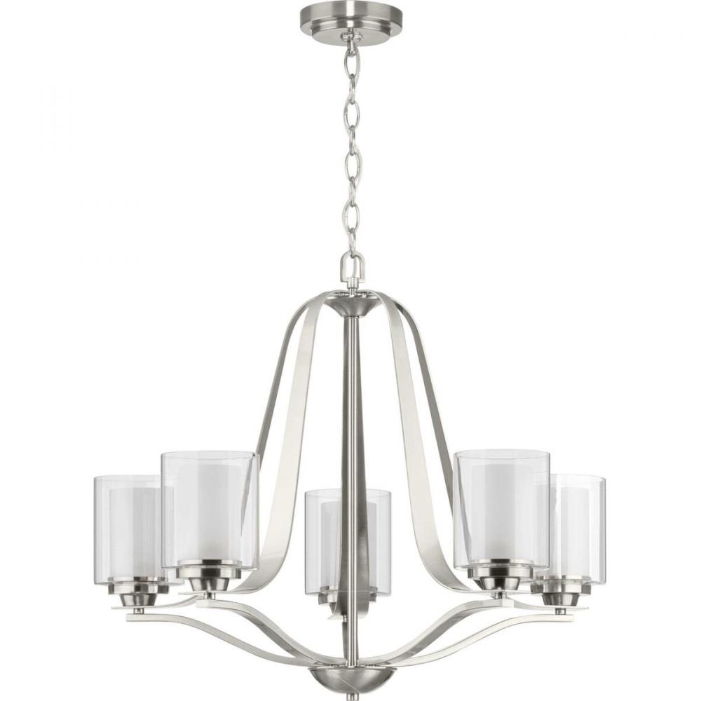 Add a modern romance to the heart of your home with this lovely chandelier. Quiet etched glass diffusers are surrounded by clear outer glass shades for a soft, luxurious touch. The shades sit on an elegant brushed nickel frame with gently flowing arms.