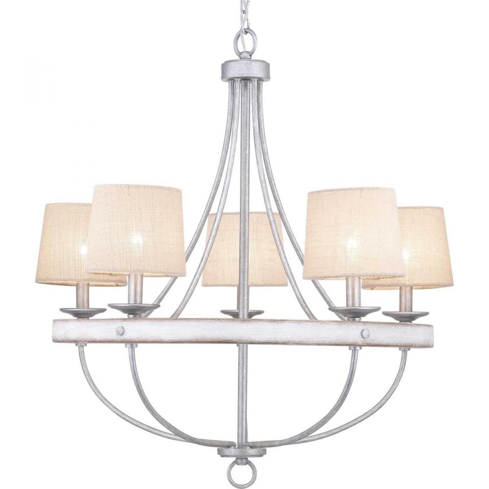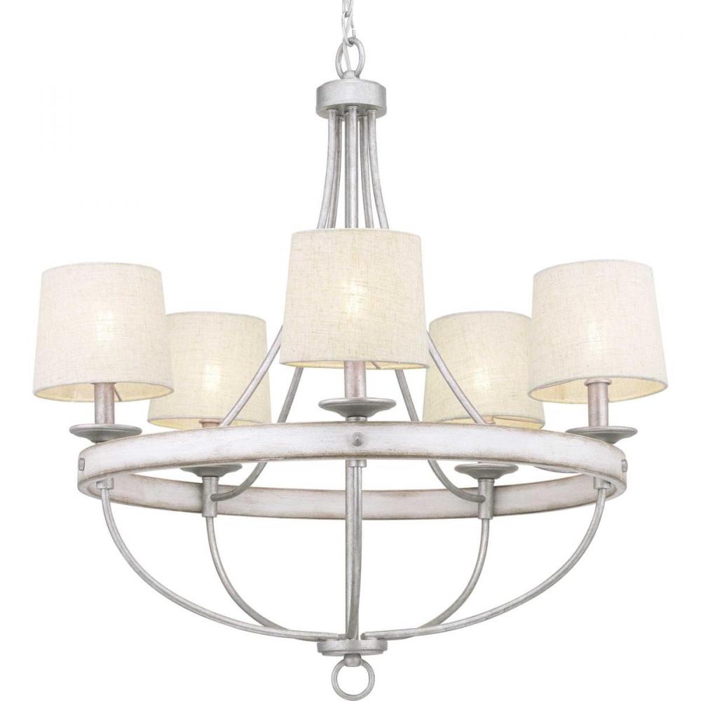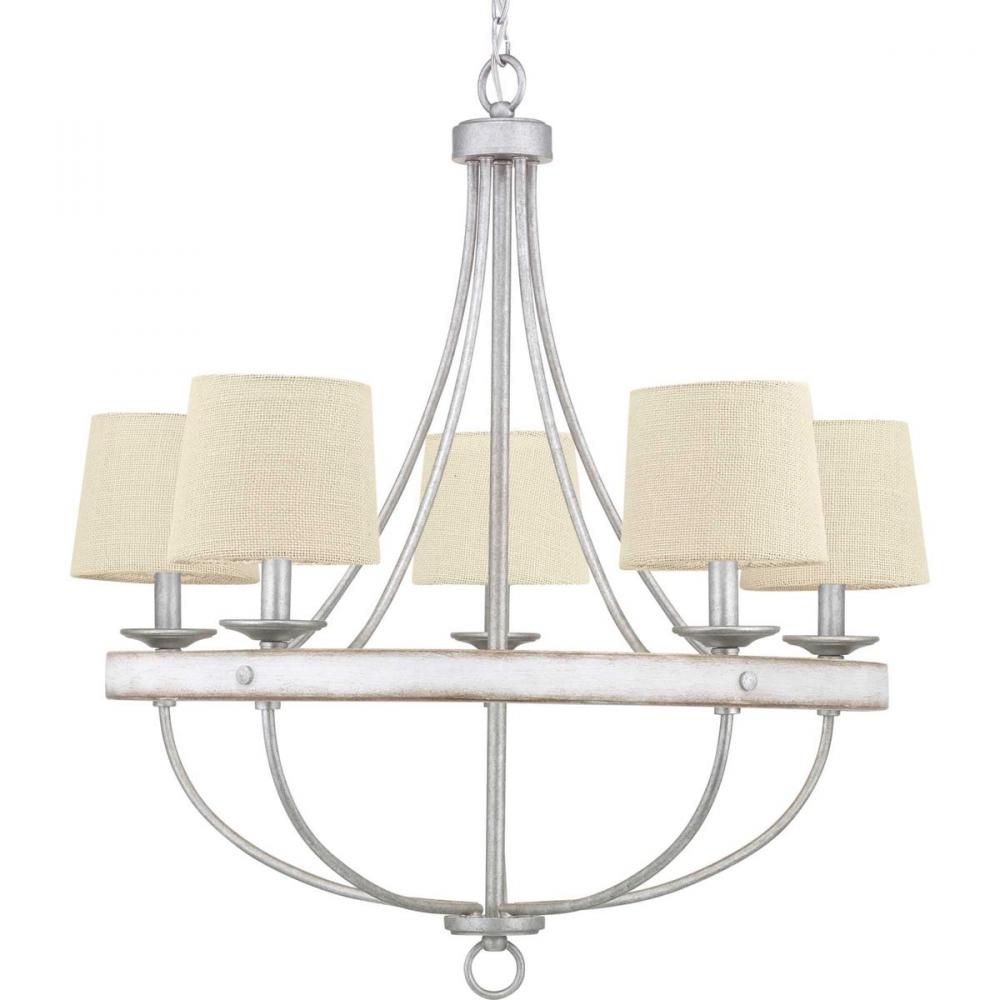 Gulliver’s deftly painted two-toned metal frame reads like a rustic wood finish;Change the look instantly with accessory shades in Natural Burlap (P860041) or Flax Linen (P860042) options;The distinguished five-light chandelier is ideal for foyers, entry