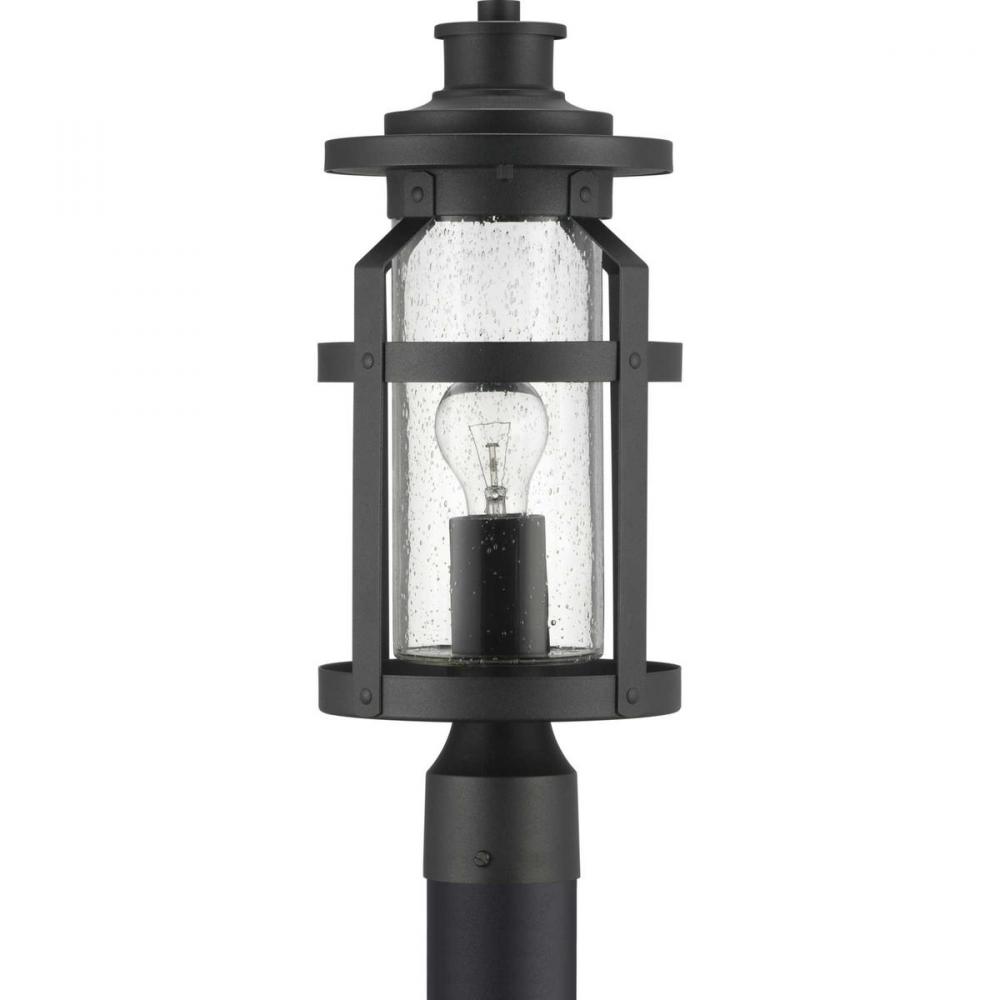 The one-light post lantern in the Haslett Collection features a design with intersecting linear details that surrounds clear seeded glass and finished in Black. Coastal-inspired frame is suitable to complement architecture with Farmhouse flair.