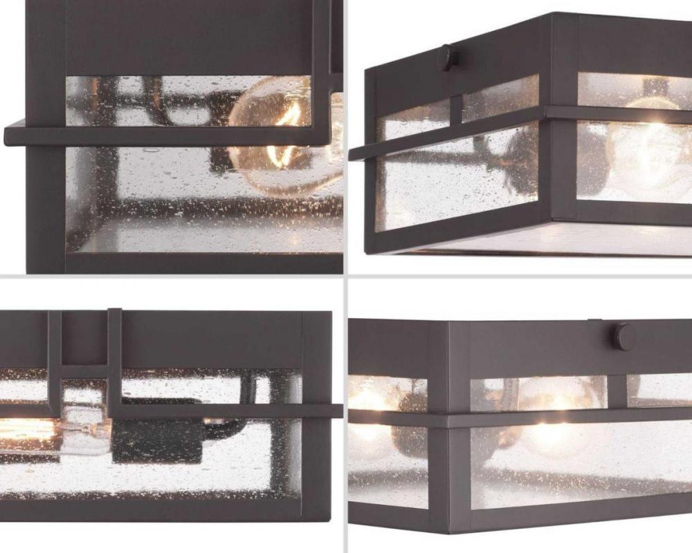 Geometric details in Boxwood’s design enhance Craftsman-inspired architecture. The two-light flush mount features clear seeded glass and finished in Antique Bronze which completes the authentic style.