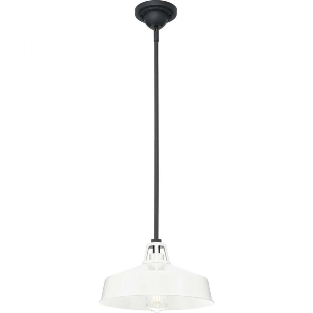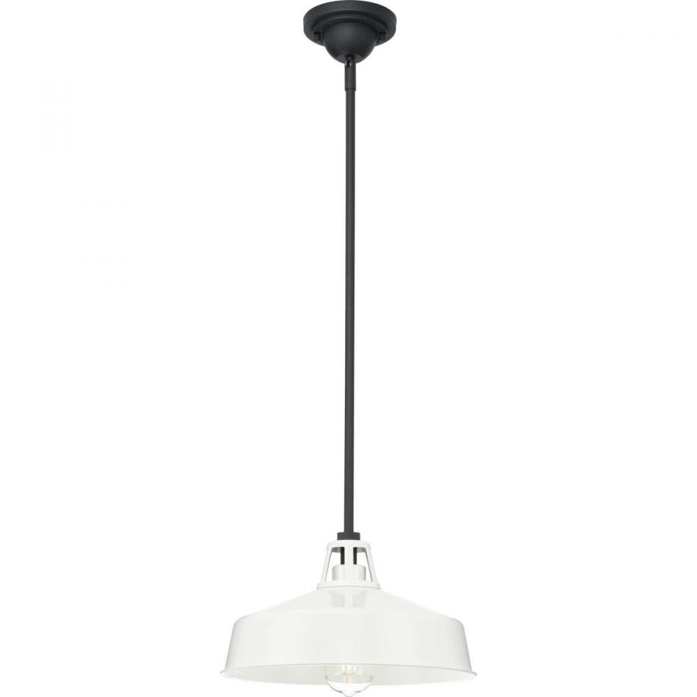 Enjoy a fun take on the traditional warehouse shade with a pendant light from the Cedar Springs Collection. The generous shade is coated in a gloss white finish. A smooth black stem holds the ceiling light in place. This classic light fixture will upgrade any farmhouse or transitional style setting. Dark Sky Friendly.