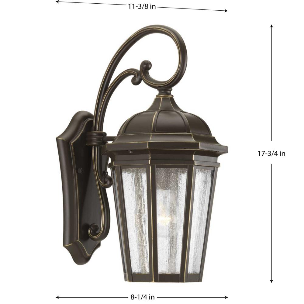 The one-light medium wall lantern in the Verdae collection offers traditional styling for a variety of exteriors. Classic and formal clear seeded glass complements an Antique Bronze finish. Open bottom design allows easy access to replace lamps. Antique Bronze finish.