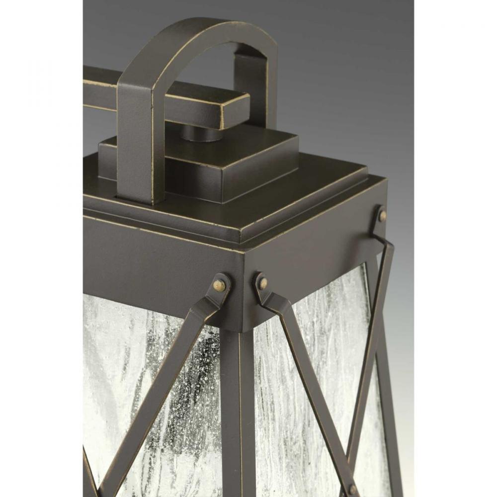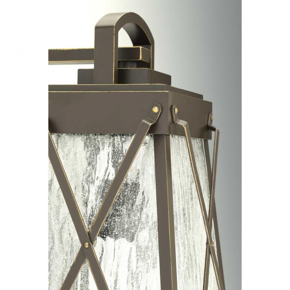 A cottage-inspired outdoor large wall lantern with a tapered cage. Creighton features clear water glass clear and Antique Bronze finish. The frame's linear details are riveted to enhance mechanical detailing of the fixture. Wall, post and hanging lantern options available. Antique Bronze finish.