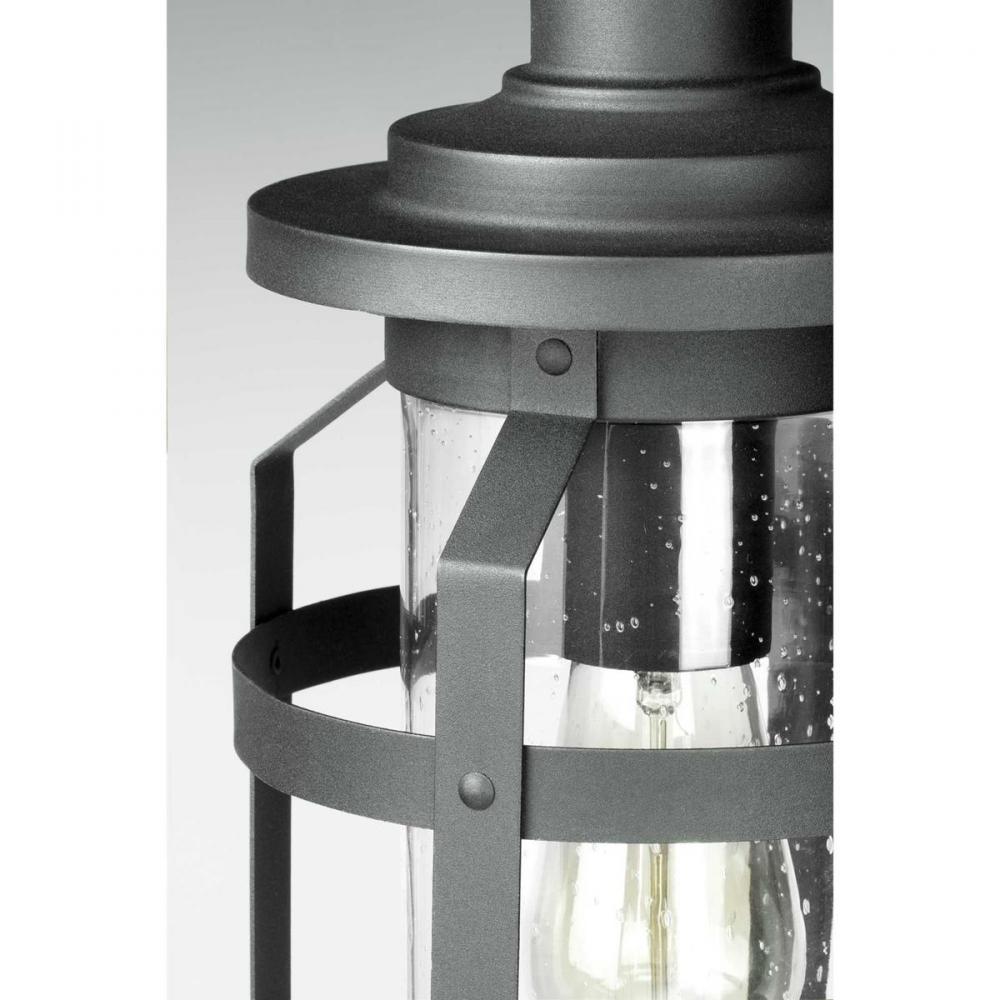 The one-light small wall lantern in the Haslett Collection features a design with intersecting linear details that surrounds clear seeded glass and finished in Black. Coastal-inspired frame is suitable to complement architecture with Farmhouse flair.