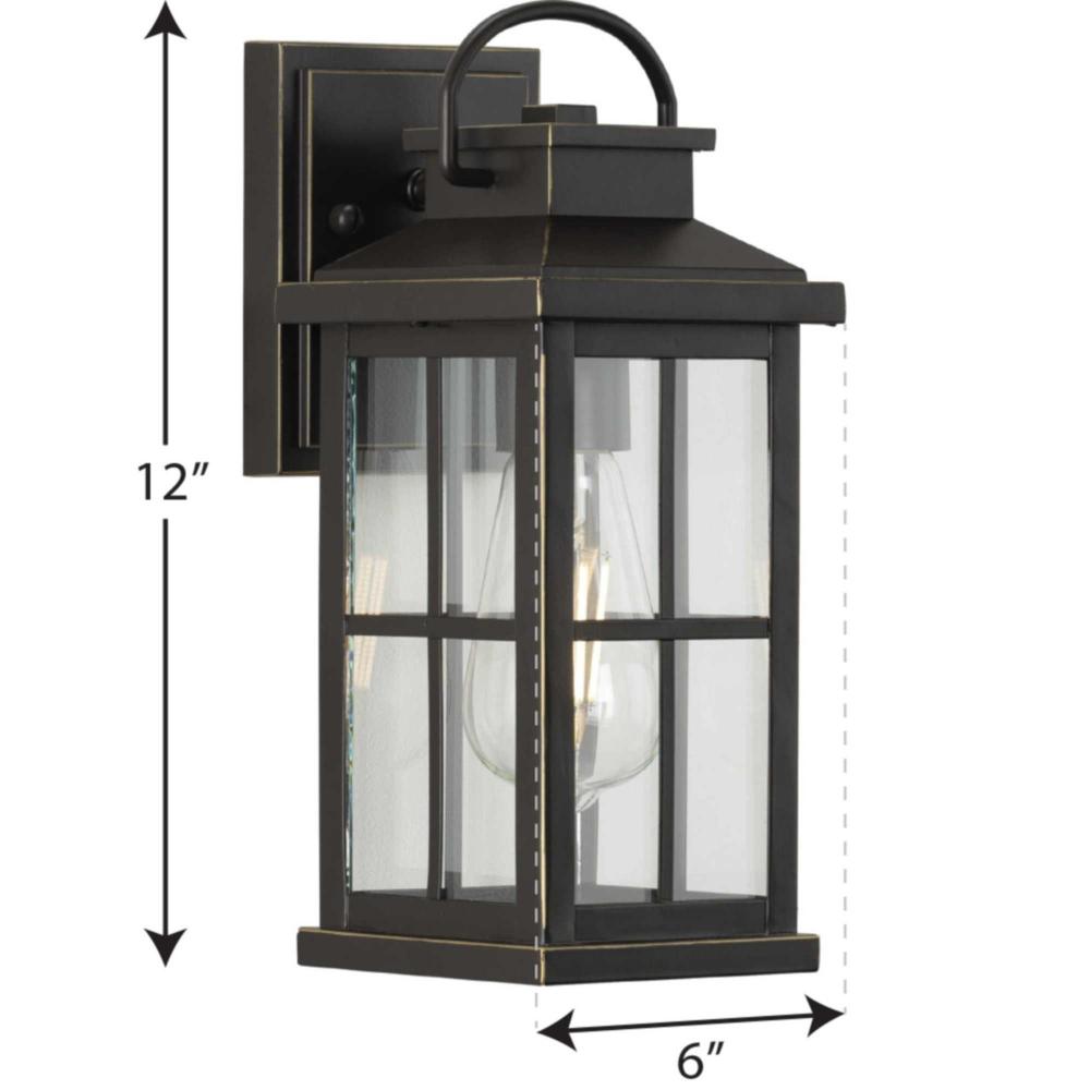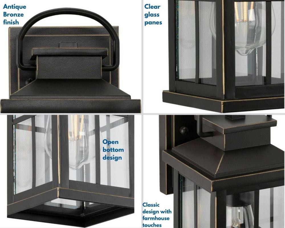 Cultivate a timeless aesthetic with the Williamston Collection 1-Light Clear Glass Antique Bronze Farmhouse Outdoor Small Wall Lantern Light. A light source glows from within clear glass panes beneath a traditional windowpane design for classic character. The elongated frame, curved handle, and square backplate are coated in an antique bronze finish for a timeless design with a touch of farmhouse flair.