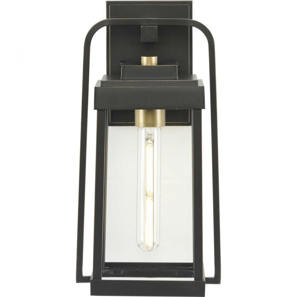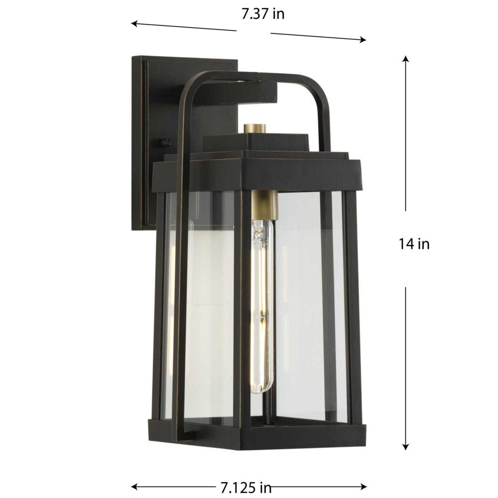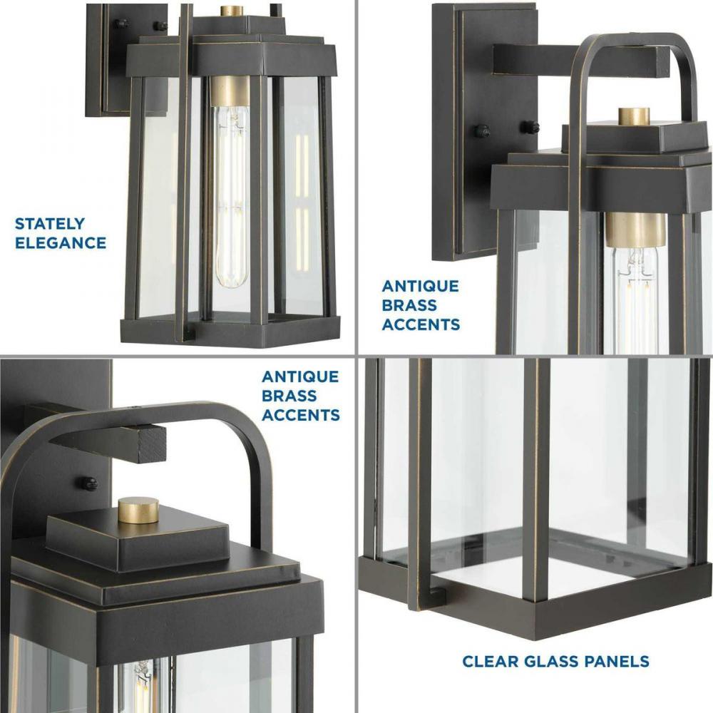 Combine a stately elegance with modern style with the Walcott Collection. The wall lantern's distinctive elongated frame holds clear glass panels. The frame is coated in a handsome antique bronze finish punctuated with brass-tone accents to add vintage charm.