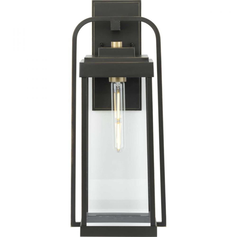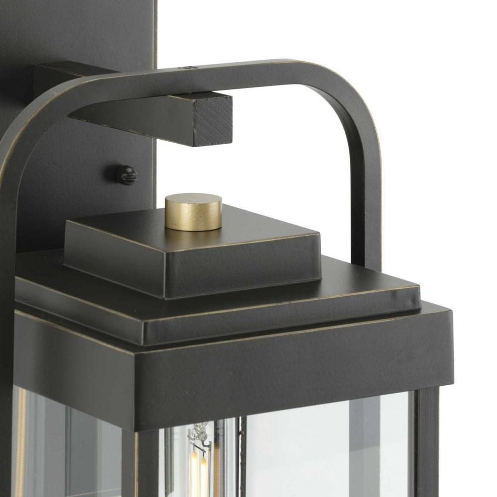 Combine a stately elegance with modern style with the Walcott Collection. The wall lantern's distinctive elongated frame holds clear glass panels. The frame is coated in a handsome antique bronze finish punctuated with brass-tone accents to add vintage charm.