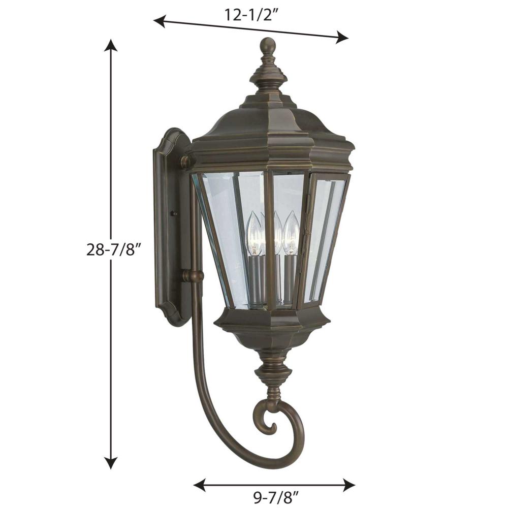 Three-light wall lantern with clear beveled glass panels and scroll arm details.