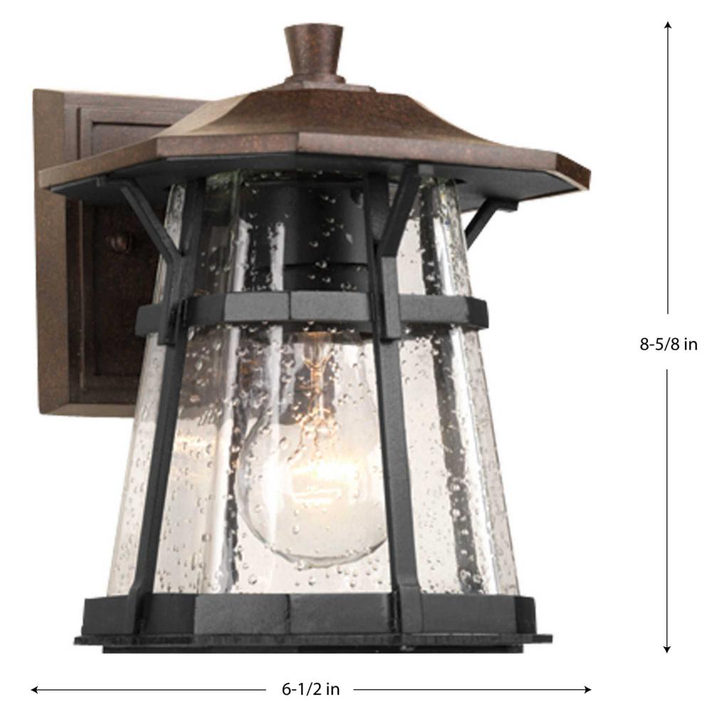 One-light small wall lantern from the Derby collection boasts a combination of Espresso and textured black powder coated finishes. The seeded glass diffuser is encased in the cast aluminum black from with the Espresso finish on the roof and back plate.