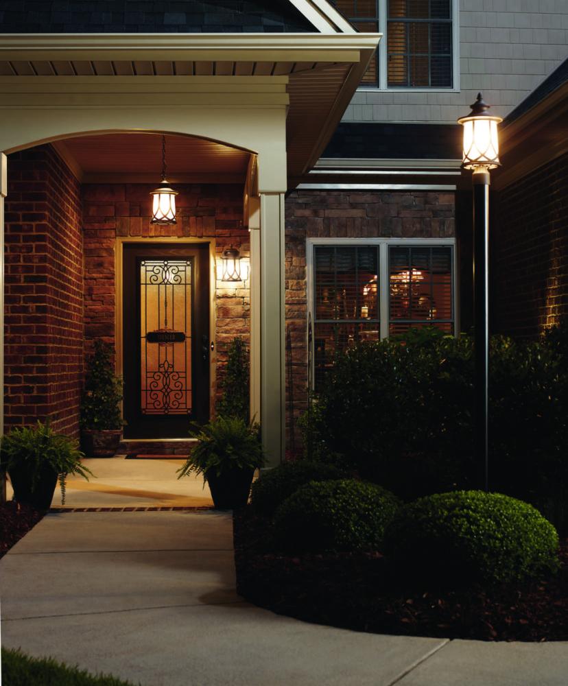 Tudor styling meets prairie design. Gradual umber tint on glass shades. A woven cast pattern encases a casual profile. Large scale cast aluminum lantern feature a durable powder coat finish. One-light post lantern.