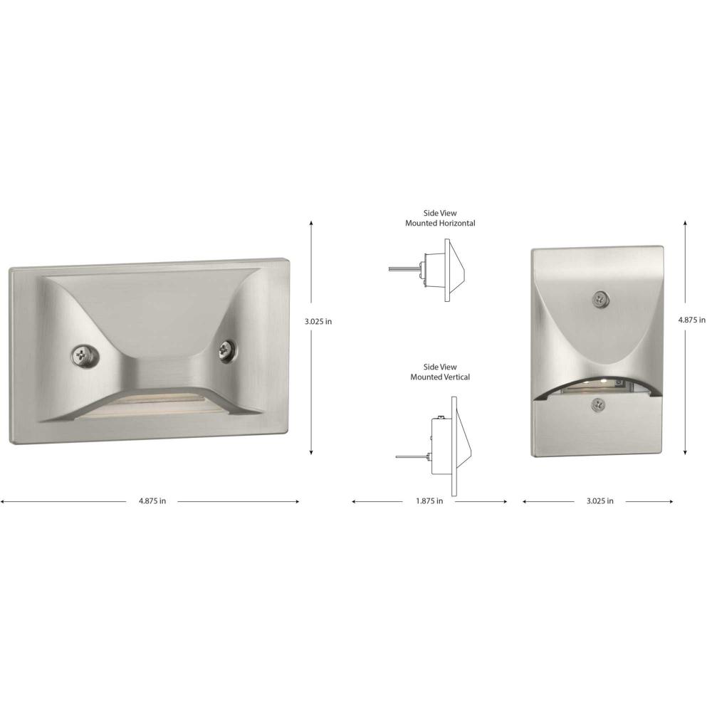 The LED Step/Wall Light finished in brushed nickel will complement many interior and exterior architectural styles, whether residential or commercial. A horizontal and a vertical exterior face plate are provided to accommodate either a horizontally or vertically oriented installation. The step light features an integrated 120V AC light engine, eliminating the need for an additional LED driver. The light engine is enclosed in a gasketed lens, allowing it to meet the rigorous demands of wet location use. Its dimmable LED light source offers optimized, energy-efficient light output, 3000K, 90CRI. The die casted face plates offer modern styling with added performance, directing the light downwards with full cut-off of higher angle light to minimize glare. Use these lights to clearly illuminate stairs, walls, and walkways, resulting in performance, cost and safety benefits. It is cCSAus wet location rated for use in areas with direct water contact.