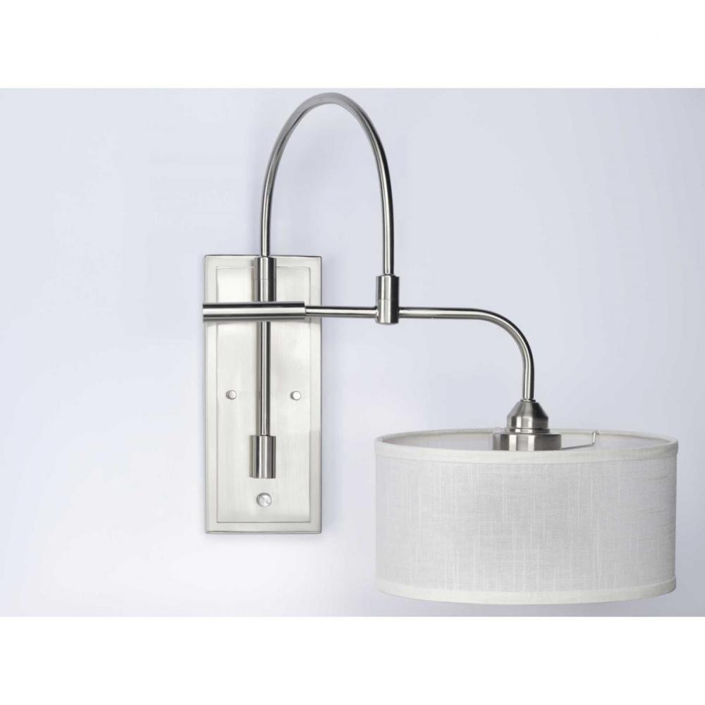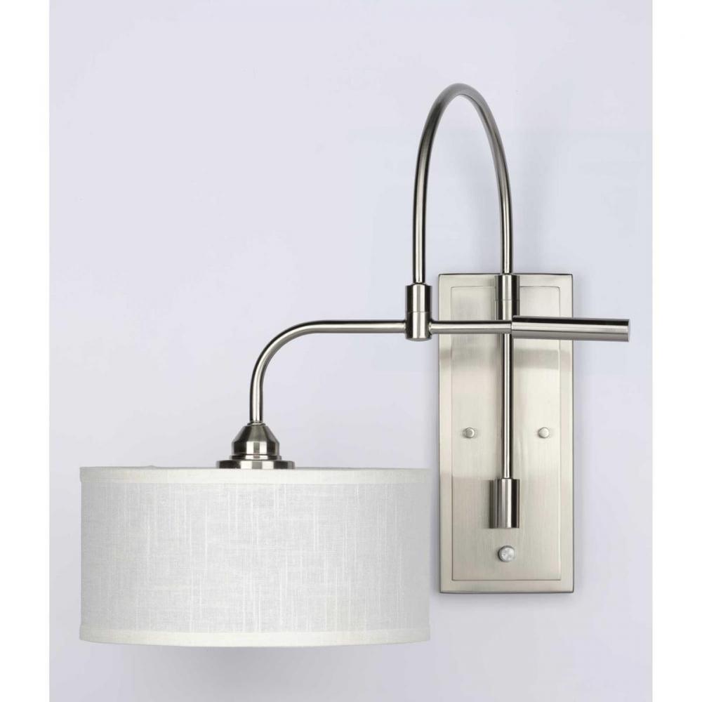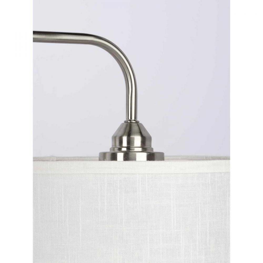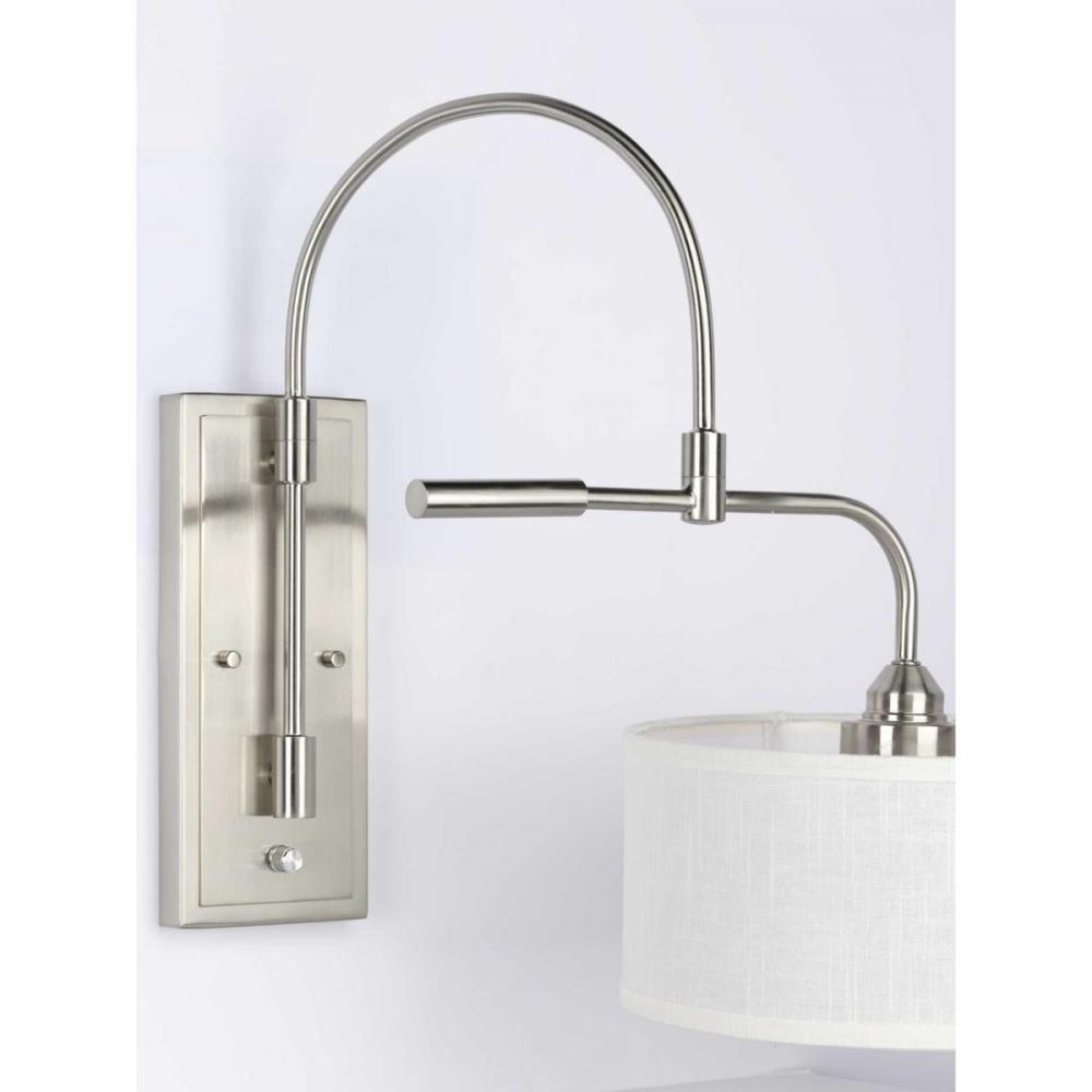 Kick back and relax within the pages of your favorite novel under the glow of the Kempsey one-light wall bracket. A smooth, arced arm extends from a rectangular backplate to hold the small, curved bar that supports a clean, Summer Linen shade. With an alluring Brushed Nickel finish, the fixture blends well with transitional and farmhouse interiors where it can provide focused task light while mounted to a wall in a bedroom, office, den, or living room.