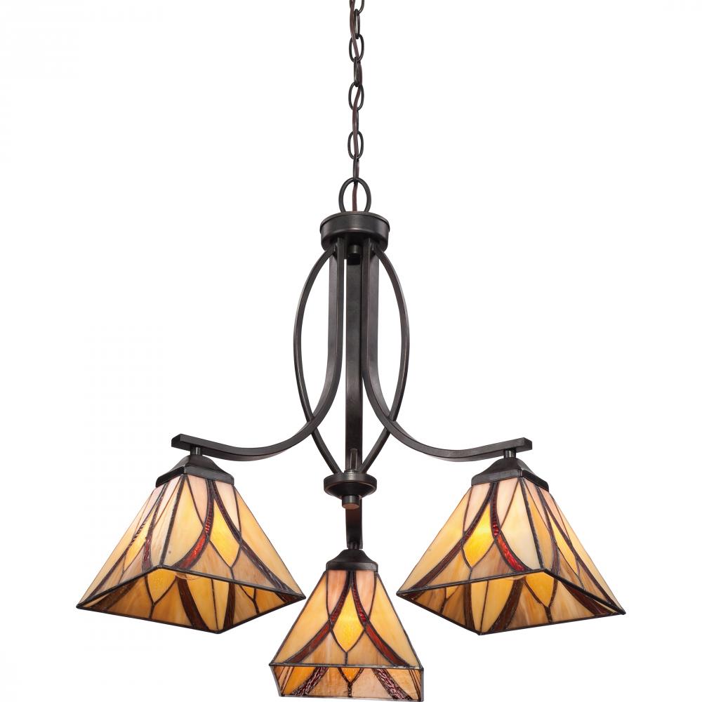 Gentle scrollwork and Tiffany style in a classic pattern brings sophistication to the Asheville Collection. The Tiffany glass is hand assembled using the copper foil method developed by Louis Comfort Tiffany. The Valiant Bronze finish anchors the traditi