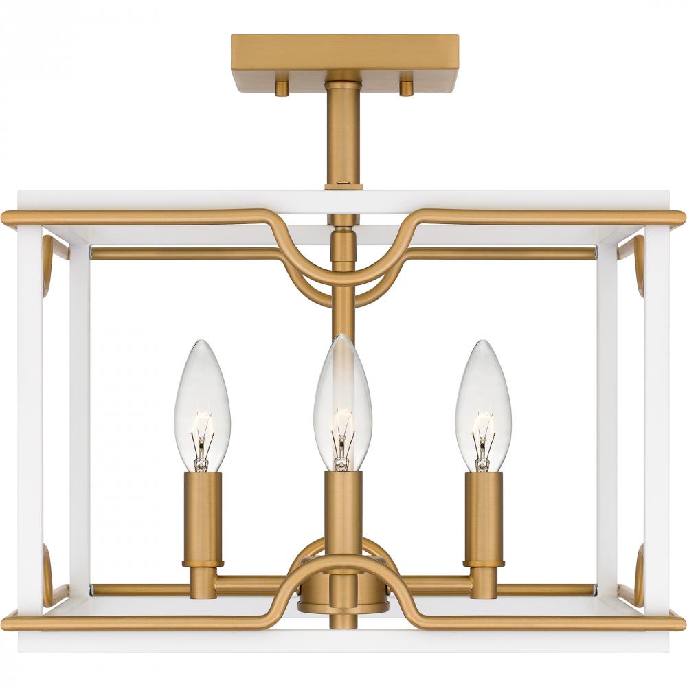 The Brinkman collection combines a matte white finish with brushed weathered brass accents for a pretty, modern contrast. Curved brass lines pair with the straight lines of the silhouette for a geometric layering effect. Available as a semi-flush mount or