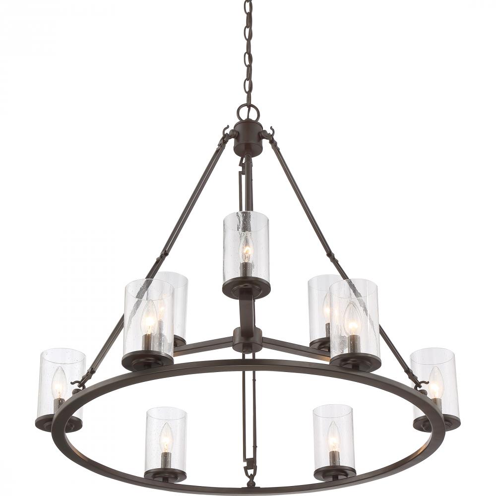 The Buchanan Collection evokes a sense of strength and style. The Western Bronze finish is a rich matte and the arms are comprised of long, rectangular links holding the piece together. The clear seedy glass adds a touch of elegance to the simplistic fra