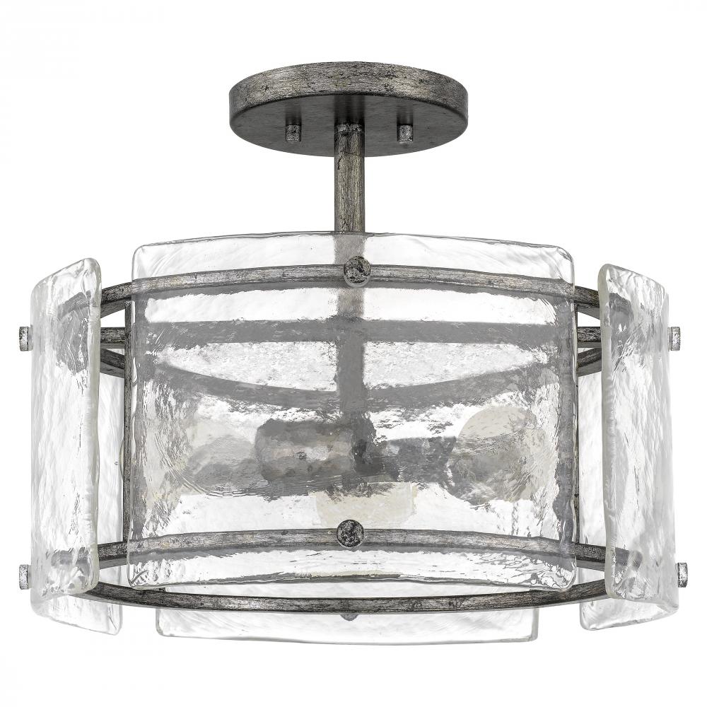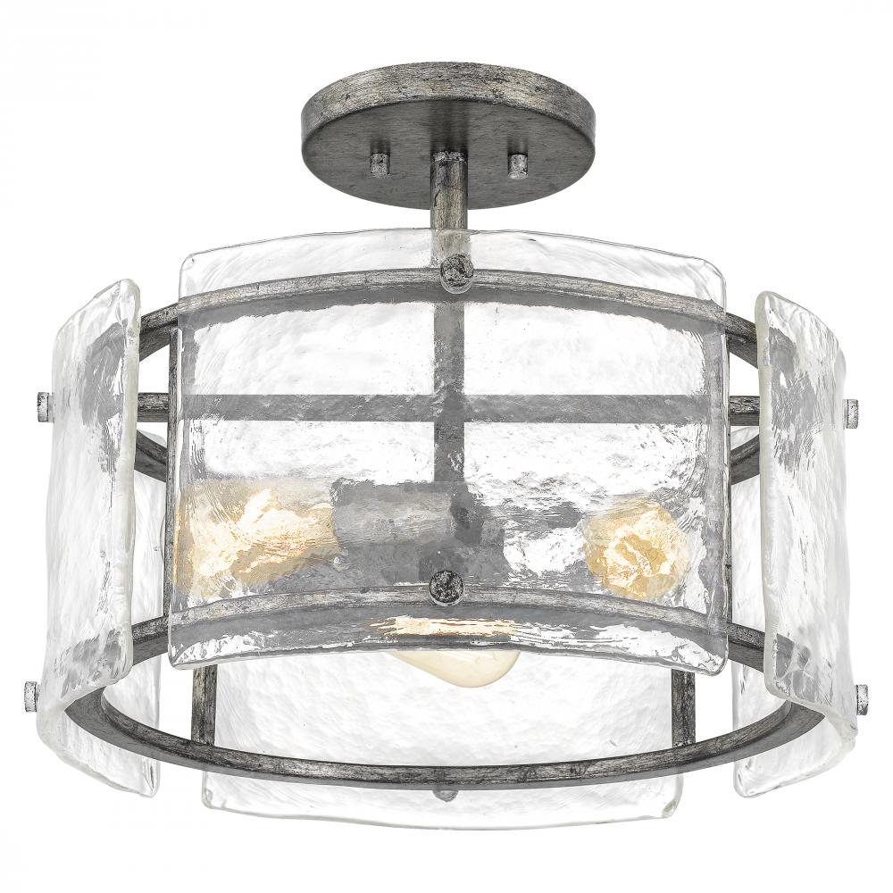 Rated for use outdoors or in, the rustic styling of the Fortress gives it an artisanal edge. Thick slabs of textured glass float around the mottled silver frame, secured with coordinating bolts. A hazy treatment of the glass is reminiscent of days gone by.