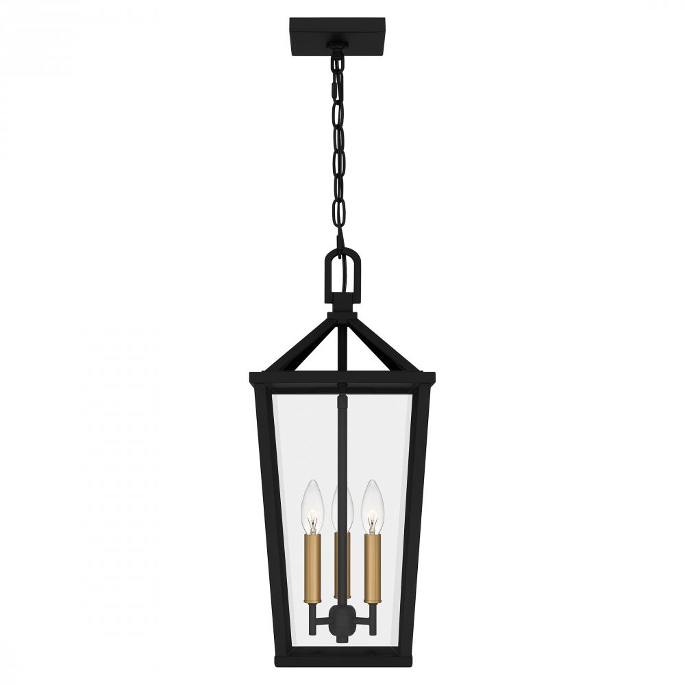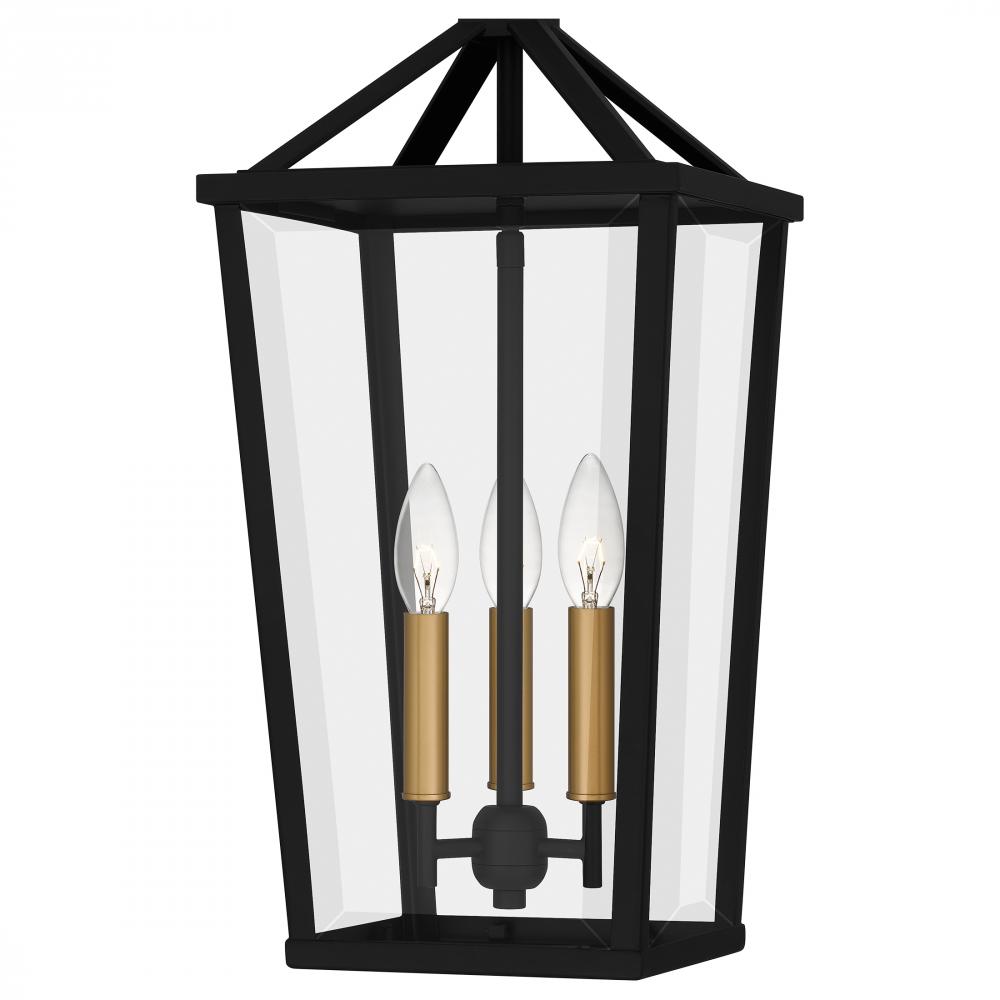 The Hull mini pendant light is a traditional lantern style pendant designed for a sleek interior. The tapered frame is finished in matte black and accented beautifully with gold candle sleeves for a hint of luster and industrial style. Clear beveled glass