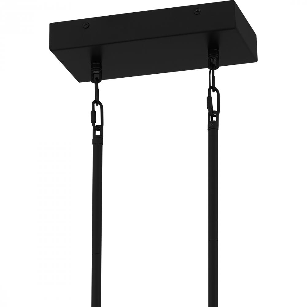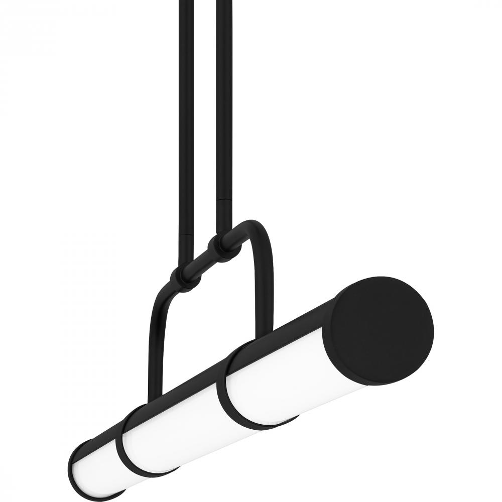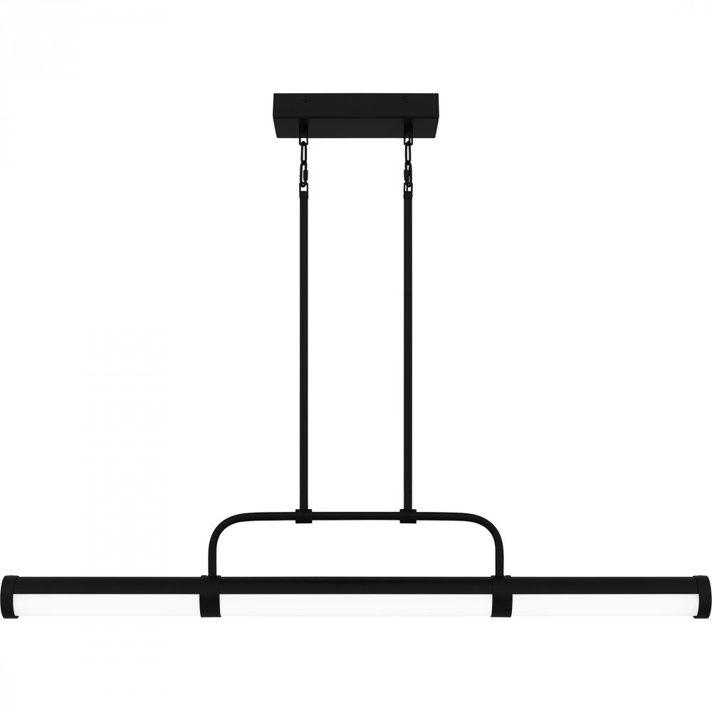 A classic black and white pairing creates a bold contrast in the Naya island light. The linear matte black frame features a white glass shade, brought to life by an integrated LED light source. Part of the popular Platinum by Quoizel collection, Nayas tran