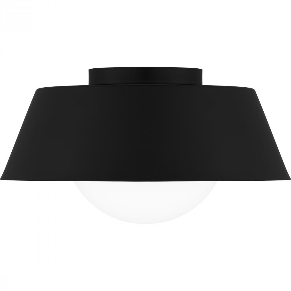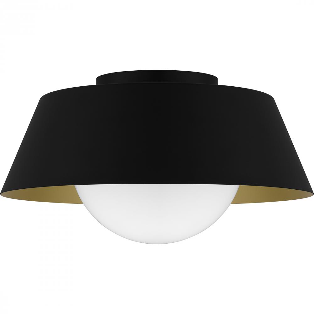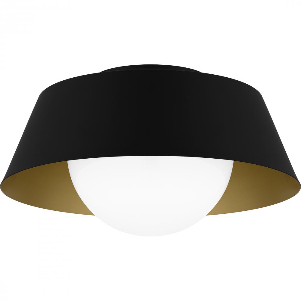 The transitional style of the Damascus flush mount is both sleek and modern. A simple drum silhouette is finished in matte black on the outside, painted with a warm brass interior for optimal illumination. An opal glass globe completes the overall look, m