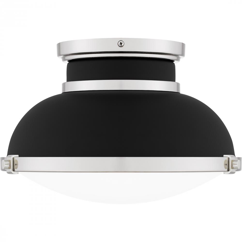 A classic design with industrial style elements, Tobias is a true standout piece in any room. The flush mount ceiling light features a matte black metal shade, accentuated by sleek polished nickel accents for a beautiful and shining contrast. A clear etche