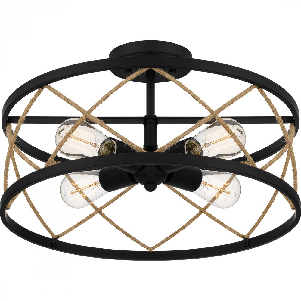 Cedar Park embraces elements of both industrial and coastal design. Part of the Quoizel Naturals line, this semi-flush mount light features an elegant lattice pattern made of rope instead of the typical metal lines. A matte black finish completes the look
