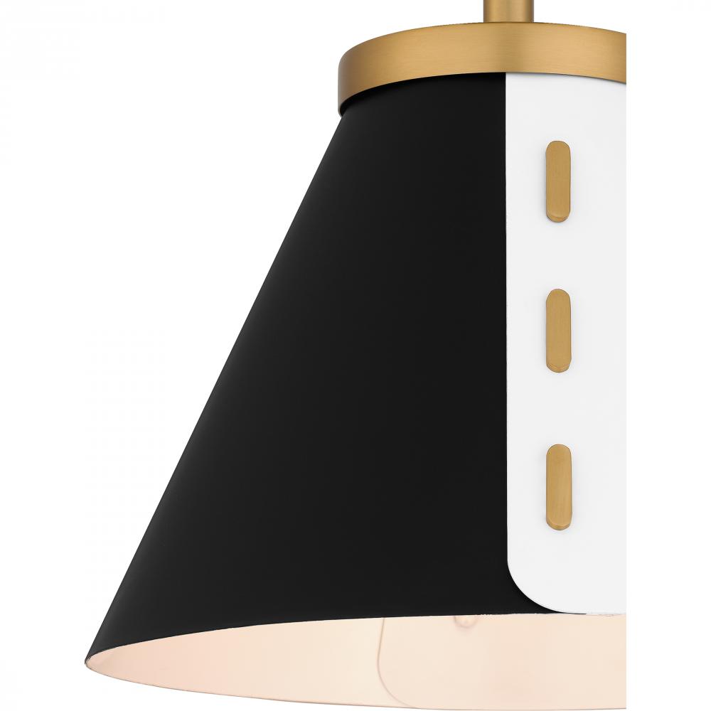 Trette semi-flush mount or pendant lights feature a fun, color block design that pairs well in any modern or contemporary setting. The black and white metal shade is complemented by a brushed weathered brass finish, adding a touch of luster to the sleek si