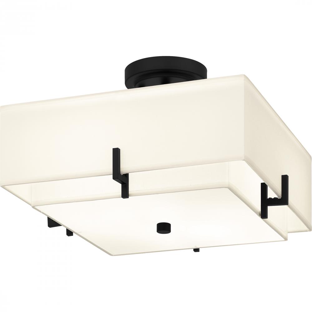 Cast a warm glow with the Renzo semi-flush mount. A square beige fabric shade surrounds a smaller shade for a unique, layered look. A matte black finish and matching geometric accents add to the transitional feel, making Renzo a perfect choice in any hallw
