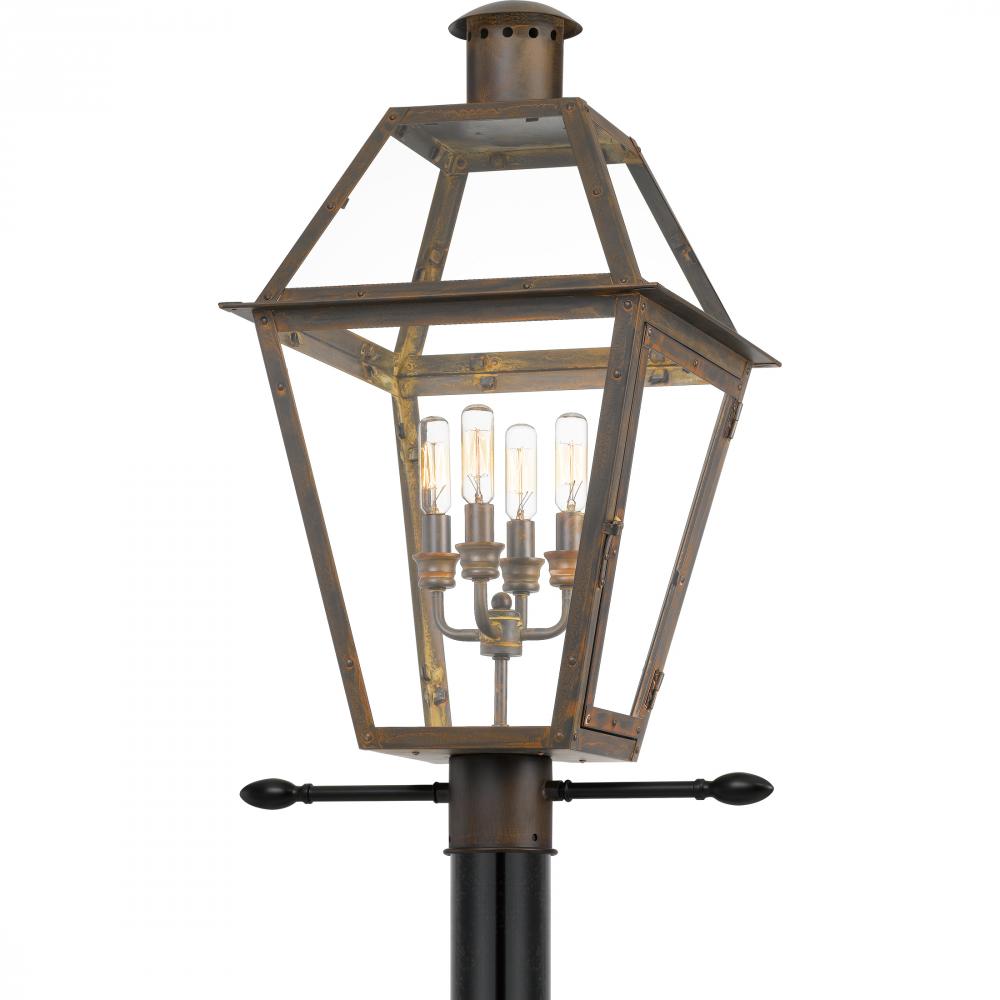 From the Charleston Copper & Brass Lantern Collection, the Rue De Royal offers the historic look of gas lighting without the hassle of a propane feed. It is all electric and features a hand-riveted solid copper or brass frame, combining the romantic charm