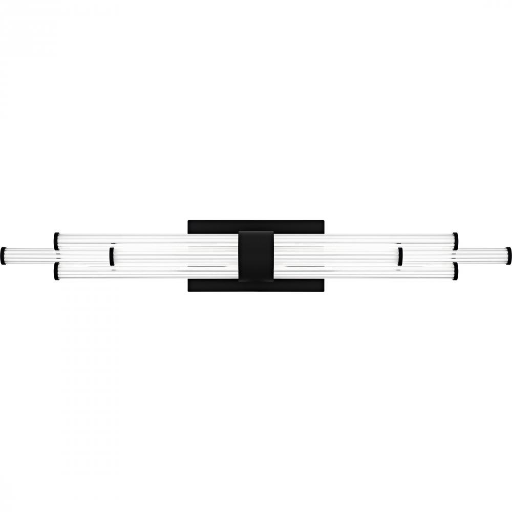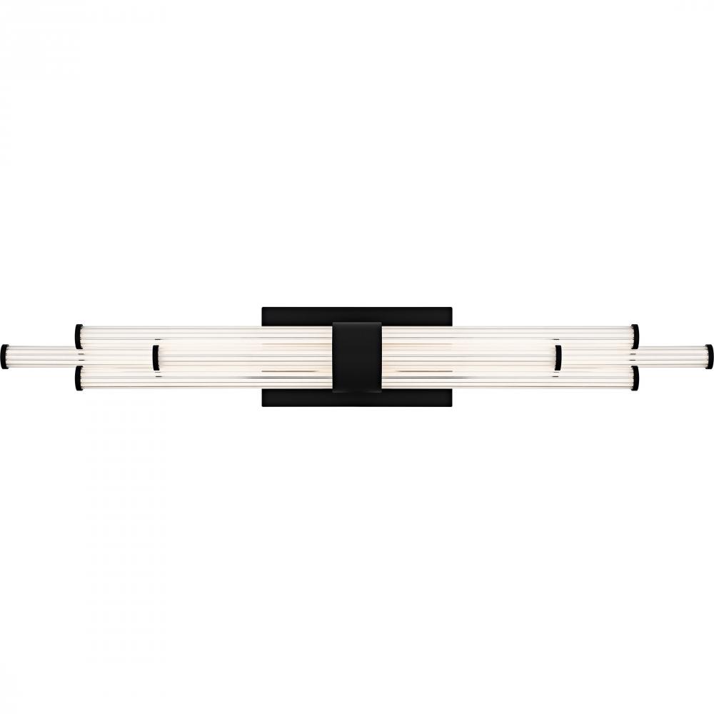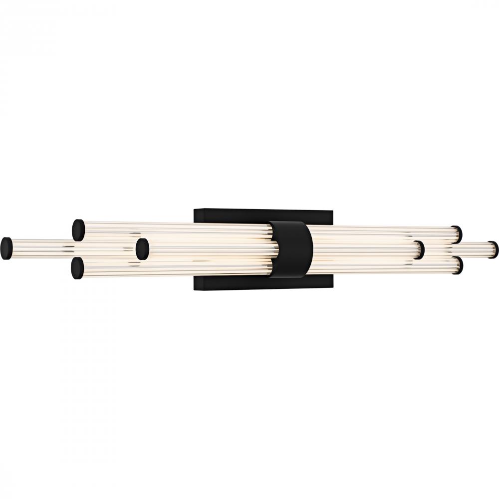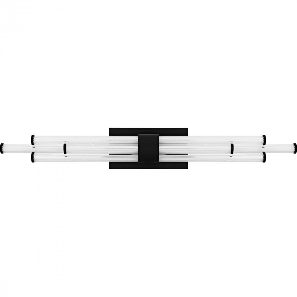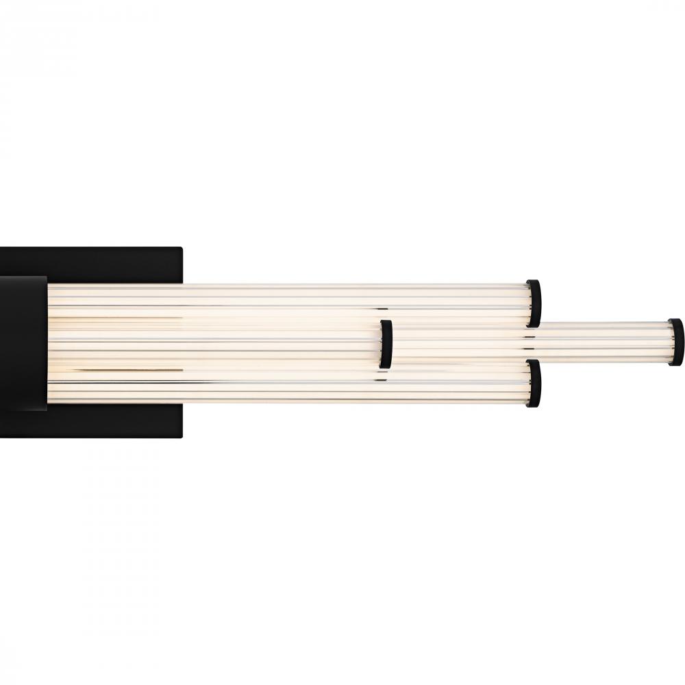 The Talbott bath light features a striking modern design with a sleek, minimalist aesthetic. The rectangular backplate contrasts with the series of parallel cylindrical acrylic rods, creating a unique and eye-catching visual. Each rod houses an integrated