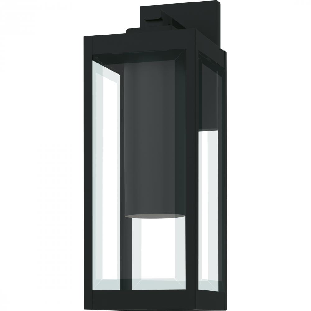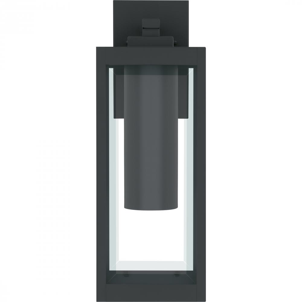 The clean lines and hand-riveted accents make the Westover outdoor wall lantern a modern industrialists dream. A long rectangular framework provides an unobstructed view of the lanterns sleek interior, highlighted by an earth black finish and clear beveled