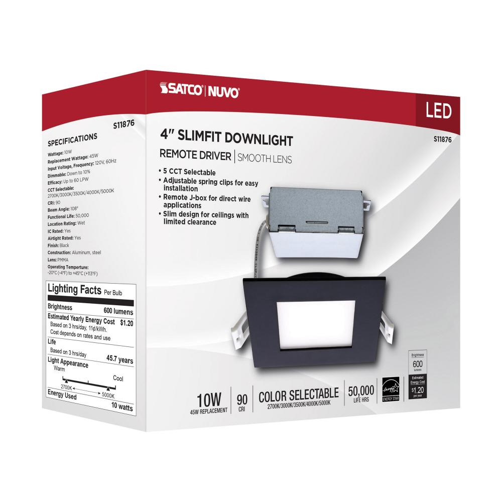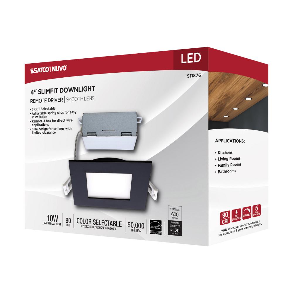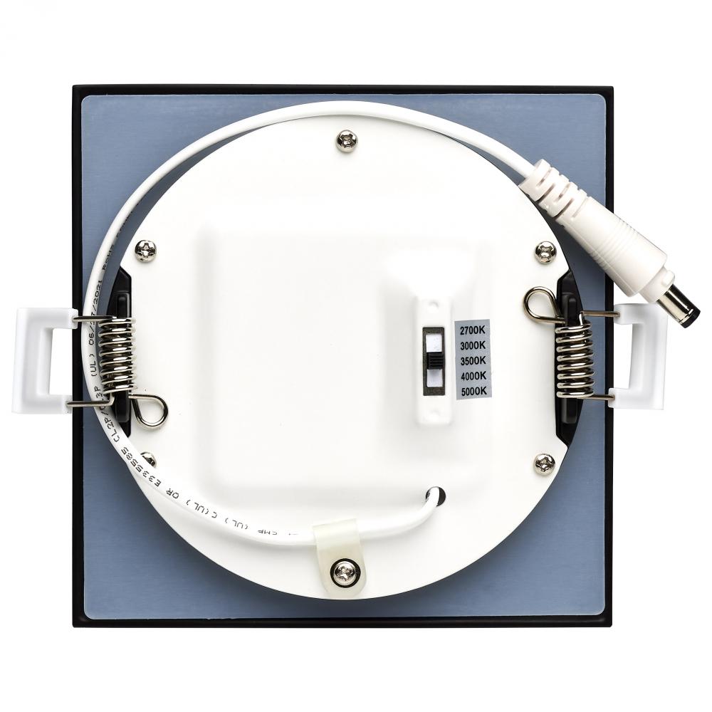 10 Watt; LED Direct Wire Downlight; Edge-lit; 4 inch; CCT Selectable; 120 volt; Dimmable; Square; Remote Driver; Black Finish