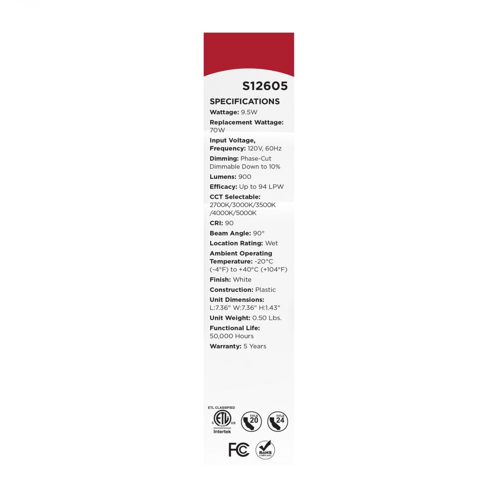 SATCO NUVO's S12605 5/6-inch square, 9.5W, Performer Series LED Retrofit Downlight combines effortless installation with a sleek, functional design. Its smooth regress baffle minimizes glare, while the integrated on-unit switch allows easy selection fr